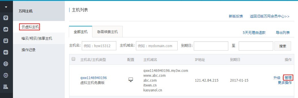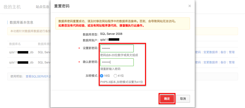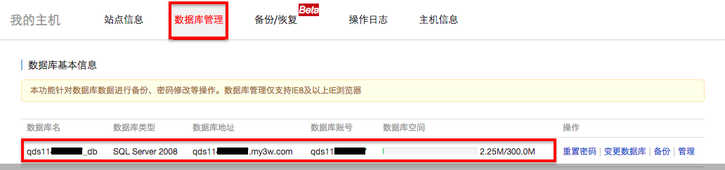 数据库信息查询及密码修改方法介绍 1、首先,登录阿里云官网http://www.aliyun.com/,然后进入管理控制台,选择点击“云虚拟主机”后选择相应主机的“更多操作”,再点击“管理”登录主机管理控制台。如下图所示: 2、再在主机管理控制台中,选择点击“数据库管理”,可以查看到数据库详细信息,如下图所示: 3、在数据库管理中,选择点击“重置密码”,输入新密码确定后就完成对数据库密码的重置修改。如下图所示: 温馨提醒:数据库管理密码重置后,请务必及时修改网站程序中的数据库连接串,如果不修改会出现数据库连接错误。 下一条: 手工修改数据库连接字符串的方法