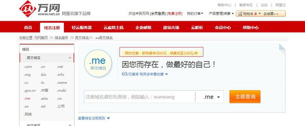 .me 域名注册推荐阿里巴巴旗下的万网,首年60块钱