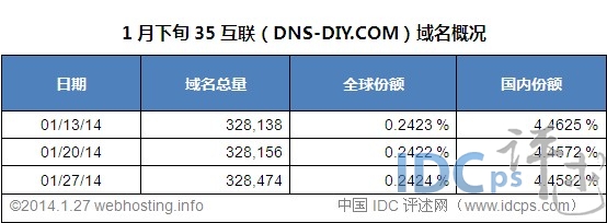 1月下旬35互联域名注册量动态:净增336个 重庆域名(www.023dns.com)消息, 据WebHosting.info数据,截至2014年1月27日,35互联域名相比1月上旬净增336个域名,但国内市场份额仍下滑至4.4582%,总量增长至328,474个。下面,重庆域名(www.023dns.com)与大家一起关注1月下旬35互联域名增长情况。 1月份35互联域名注册量走势,如下图所示: 从上图中我们能够知道,根据域名走势曲线分析,35互联域名总量即将突破32.8万个。1月份,35互联域名增势非常的良好,但增长并不平稳。在1月下旬(1月13日-1月27日)期间,35互联域名增势最为的良好,增幅明显比之上旬要明显。 35互联域名增长数据,如下图所示: 从图中我们能够看出,在1月下旬期间,35互联域名增量呈上升趋势,域名净增336个域名,总量从328,138个增长至328,474个。在全球域名市场上,份额没有太大的变化,相对平稳。但在国内,市场份额则呈现出下滑的趋势。 综合以上最新数据,35互联域名1月下旬净增336个,国内市场份额下降至4.4582%。 |
