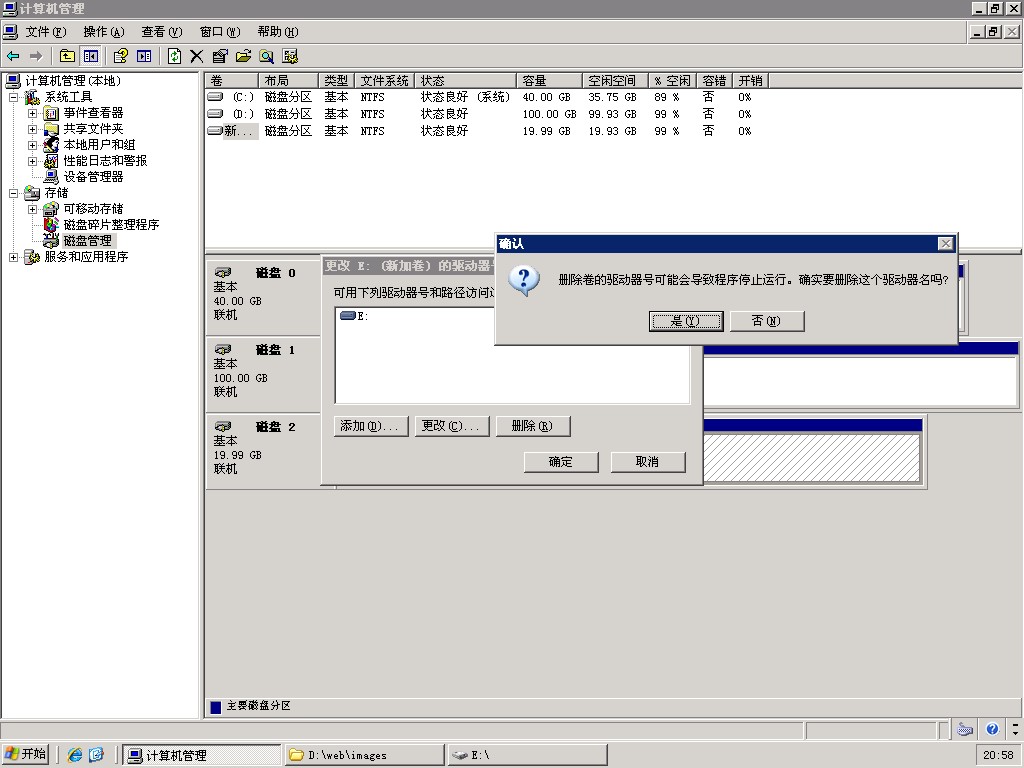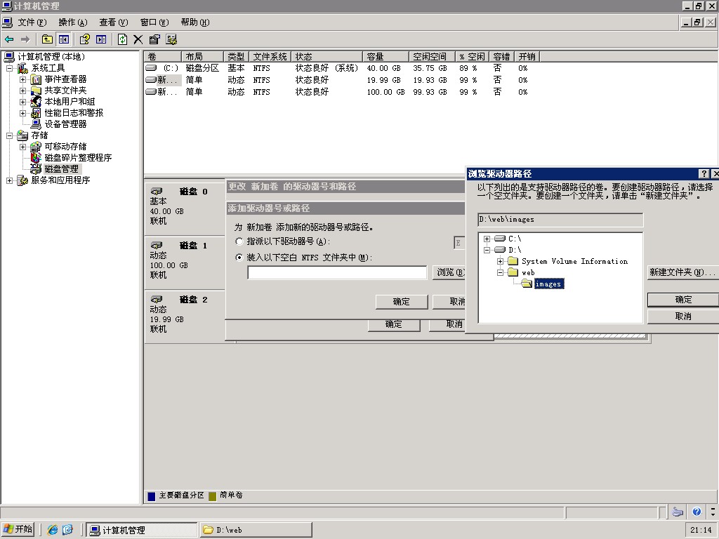 ECS Windows在不修改网站设置的情况下如何使用新数据盘 在用户的实际应用中,有可能会因为业务增长而出现磁盘空间不足的情况。当用户升级购买新的数据盘后,需要将原磁盘的数据完全复制过去,原磁盘空间就会被浪费,同时还需要修改网站设置以指向新的数据盘,操作起来会比较麻烦,因此用户可以考虑通过以下方式做到兼得。操作方法如下所示: 1、用户在操作前先需要暂时停止业务,原数据盘D盘中存放网站目录web,预判将来空间增加长最大的目录,例如这个目录是image,新购买的磁盘自动分配到盘符为E盘,我们先将其中的数据移动到E盘的目录中。如下图所示: 2、然后打开windows的磁盘管理,右击新的E盘,选择“更改驱动器号与路径”,点击删除。如果尚未指定盘符,此时可以忽略此步骤。 3、然后依次点击【更改新加卷的驱动器号和路径】->【添加新驱动器号和路径】->【装入以下空白NTFS文件夹中】->【浏览】->【选择目录D:\web\image】->【确定】即可。 用户按照上面操作,可以在不修改网站配置的情况下,实现将保存D:\web\image中的数据实际上占用新数据盘的空间,这个操作也可以换成其它的目录,具体看用户的业务需求就可以了。 如问题还未解决,请联系售后技术支持。