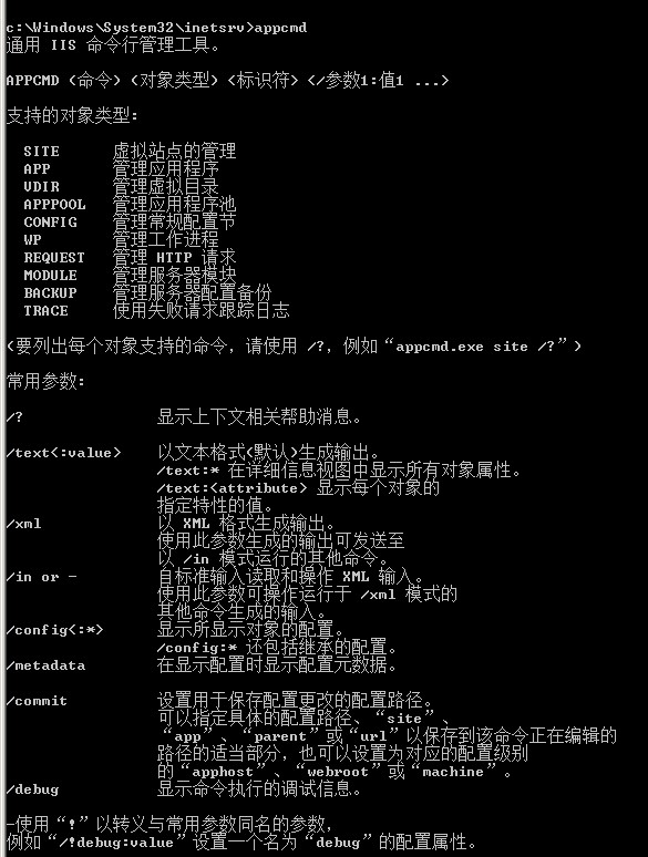 阿里云ECS Windows如何通过系统appcmd命令操作IIS7配置 IIS7 中的appcmd命令使用方法如下: appcmd.exe 位于 C:\Windows\System32\inetsrv 目录 使用 cd c:\Windows\System32\inetsrv 切换到该目录 IIS 命令行管理工具基本格式: APPCMD (命令) (对象类型) <标识符> 支持的命令: list 列出虚拟站点 set 配置虚拟站点 add 添加新虚拟站点 delete 删除虚拟站点 start 启动虚拟站点 stop 停止虚拟站点 支持的对象类型: SITE 虚拟站点的管理 APP 管理应用程序 VDIR 管理虚拟目录 APPPOOL 管理应用程序池 REQUEST 管理 HTTP 请求 MODULE 管理服务器模块 BACKUP 管理服务器配置备份 CONFIG 管理常规配置节 WP 管理工作进程 TRACE 使用失败请求跟踪日志 执行 appcmd list site 直接列出了iis上所有的站点,绑定的域名和对应的站点状态。如下所示: 另外我们可以使用appcmd list request /site.name:"网站名称" 或者 appcmd list requests /apppool.name:应用程序池名称 来查看当前的http请求数。 详细的命令参数用户可以输入appcmd进行查看和测试。 如果问题还未能解决,请联系售后技术支持。