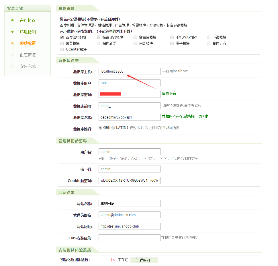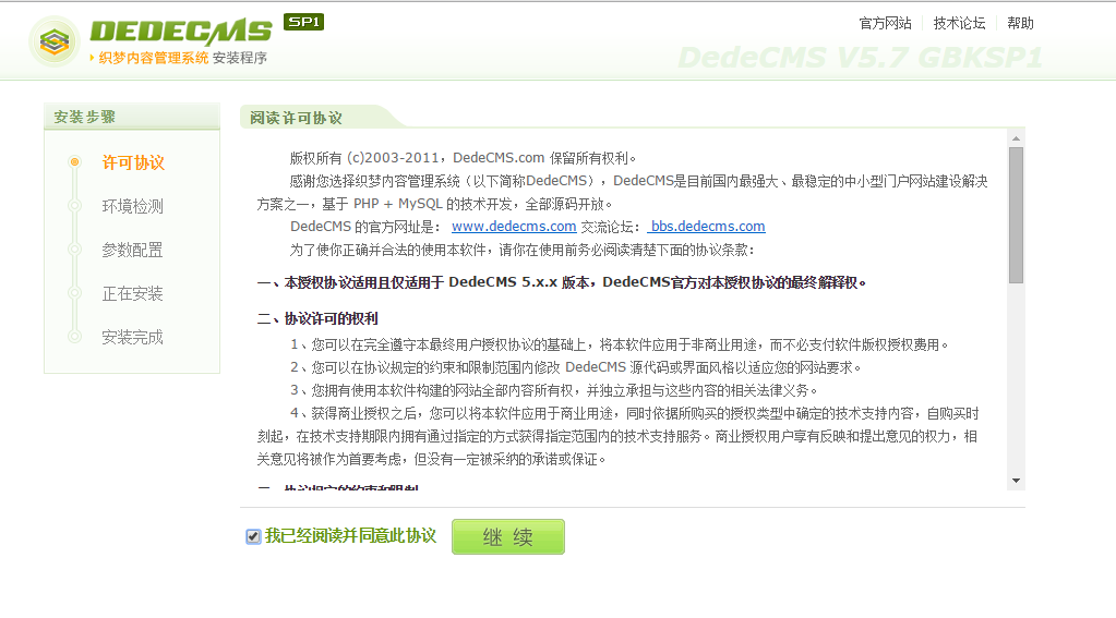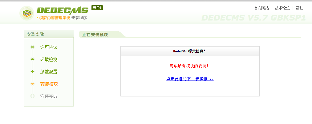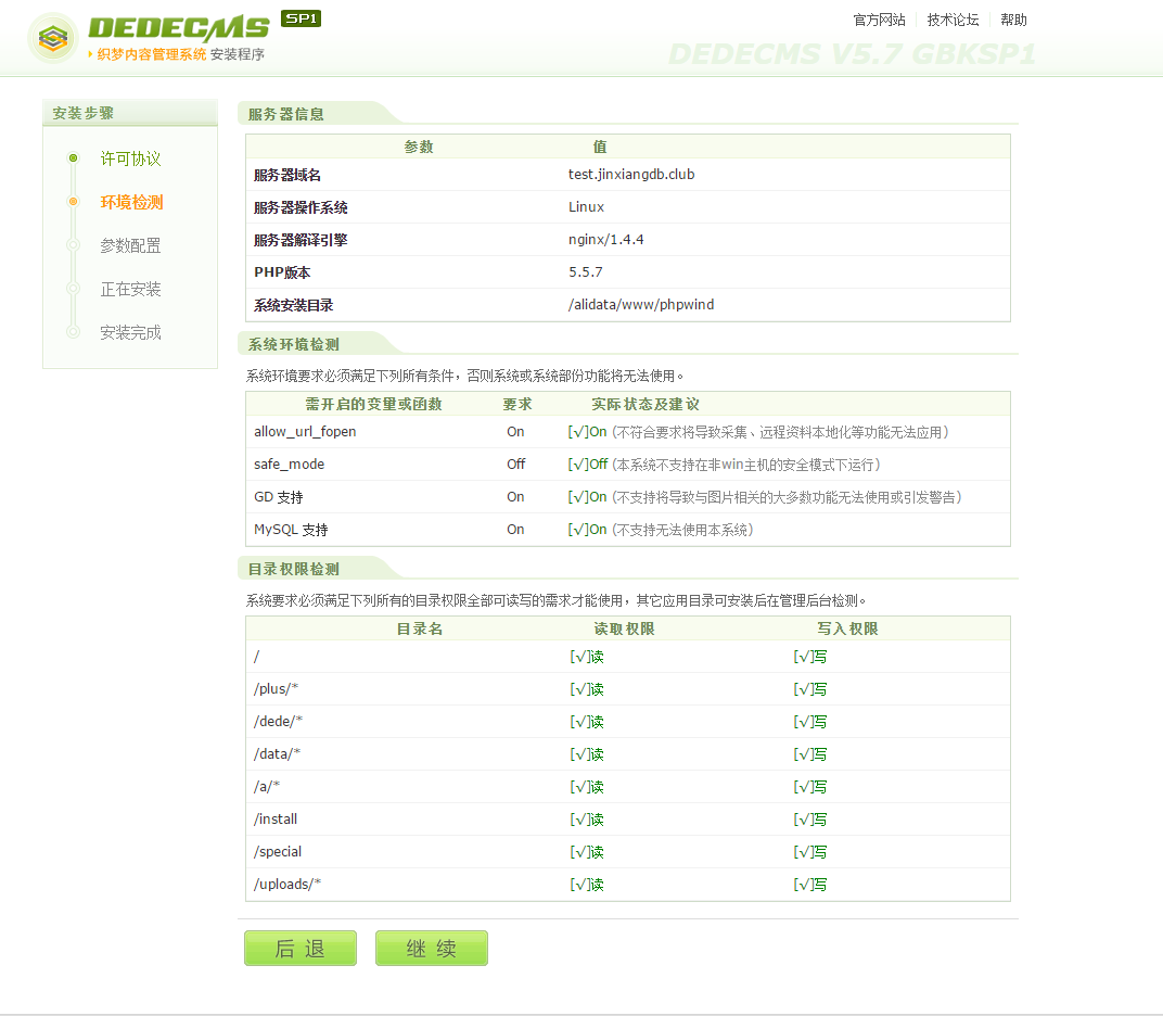 访问http://www.dedecms.com/products/dedecms/downloads/ 地址下载最新织梦安装程序。 将DedeCMS-V5.7-GBK-SP1.tar.gz 文件上传到服务器上。通过tar -zxvf命令解压文件。将uploads 文件夹下程序文件移动到站点目录下,修改目录文件夹权限。访问到安装界面。 全检测通过,点击继续 进入数据库配置页面。注意在数据库主机,添加数据库地址时添加3306端口,点击继续。 继续后就会提示安装完成。 访问主页测试