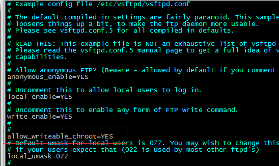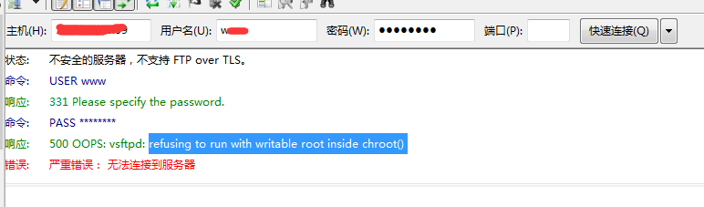Linux系统用Vsftpd搭建的FTP服务,客户端连接时提示“500 OOPS: vsftpd: refusing to run with writable root inside chroot()”错误 解决方法: 在服务器上修改Vsftpd的配置文件vsftpd.conf vim /etc/vsftpd/vsftpd.conf 添加一行配置 allow_writeable_chroot=YES 后保存退出,重启一下vsftp服务就行了。