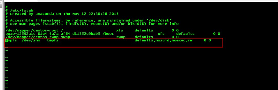 在fstab文件中加入tmpfs /dev/shm tmpfs defaults.nosuid,noexec,rw 0 0