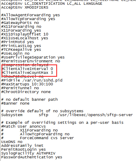 使用Linux服务器,用客户端比如securecrt连接服务器,若长时间没有操作就会自动断开,如果想这事客户端断开自动重连,可以参考链接:http://help.aliyun.com/knowledge_detail/6675016.html?spm=5176.7618386.5.1.eSc5Ry 也可把sshd判断客户端断开检查的时间设置相对长些,打开/etc/ssh/sshd_config配置文件,如下图所示: 一般建议可把ClientAliveInterval参数改成300s,ClientAliveCountMax参数改成3,意思就是每隔5分钟服务器给客户端发送一个消息,正常客户端都会响应的,若没有人操作或客户端异常,连续ClientAliveCountMax也就是连续3次都没有响应服务器,服务器就会断开客户端的ssh连接。 请注意:修改ssh配置需重启ssh服务才生效