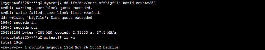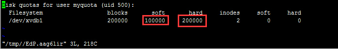 在服务器管理时,因为磁盘空间资源有限,通常需为多用户的服务器设定用户的linux磁盘配额,限制每个用户可使用的空间资源。Quota是在Linux下实现磁盘配额的工具,以下使用CentOS为例进行说明。 1、调整需进行配额管理的磁盘,在/etc/fstab中添加quota管理对应的参数 调整完成后可通过如下命令让quota生效 mount -o remount,usrquota,grpquota /对应磁盘挂载点 或也可直接重启服务器对磁盘进行重新挂载。 2、通过quotacheck扫描整个服务器系统中含有usrquota,grpquota的文件系统,扫描结束之后,会有aquota.group和aquota.user这两个文件在挂载目录下生成。 3、启动quota 请注意: 若想要关掉该服务的话可用quotaoff命令。 [root@iZ25****qZ ~]# quotaoff -u /test 4、用edquota设置用户针对特定用户(在此以myquota帐号为例)的磁盘使用限制。 edquota -u myquota 调整图中soft和hard的值,图中举例调整的是分别为软限制100M和硬限制200M。 5、测试结果如下 若该用户创建文件大小小于soft,可正常创建。 若该用户创建文件大小介于soft与hard之间,会出现警告,也可正常创建。 若该用户创建文件大小超过hard,创建失败。