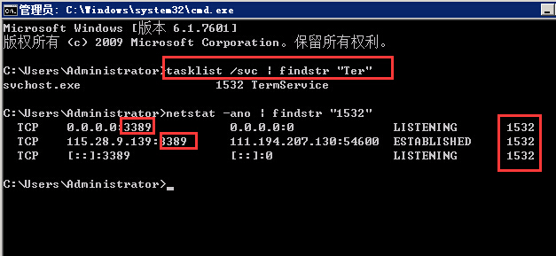 ECS window服务器如何找回远程端口 Window服务器忘记远程端口的找回方法如下所示: 1、用户首先通过管理控制台的管理终端登录服务器。如下图所示: 2、然后登录服务器后打开cmd窗口,执行 tasklist /svc | findstr "Ter" 查看远程服务进程ID,再根据进程ID查看监听端口,执行netstat -ano | findstr "进程ID",如下图所示: 就可以看到监听端口是3389。 也可以反过来,比如知道某个端口1111,想知道哪个进程在监听,用户可执行netstat -ano | findstr ":1111" 查到进程ID,然后执行tasklist /svc | findstr "进程ID" 就可以查看进程服务了。 用户也可以通过注册表查看远程端口,修改远程端口,具体操作可以参考【点此查看】 如问题还未解决,请联系售后技术支持。