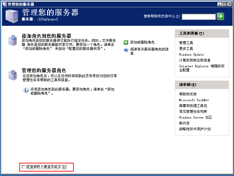 ECS Windows 系统如何设置登录时不自动启动“服务器管理器” 远程登录Windows服务器时,系统默认将自动打开一个“服务器管理器”的对话窗口,平时是用不上的,每次都得手动关闭窗口,这样比较麻烦,其实用户可以设置让其不自动启动,设置方法如下所示: Windows 2012系统打开管理——服务器管理器属性,勾选“在登录时不自动启动服务器管理器”,如下图所示: Windows 2008系统,勾选“登录时不要显示此控制台”,如下图所示: Windows 2003系统,勾选“在登录时不要显示此页”,如下图所示: