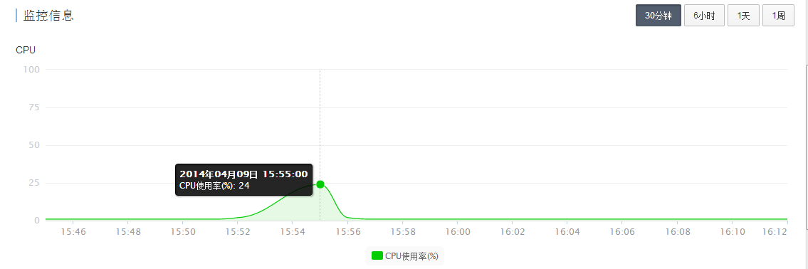 在云服务器实例列表中,选择一台云服务器,在下方点击选择【监控信息】,会出现3幅监控图,它们分别是:CPU使用率、网络带宽,可以看到最近30分钟,6个小时,1天和1周的监控数据。