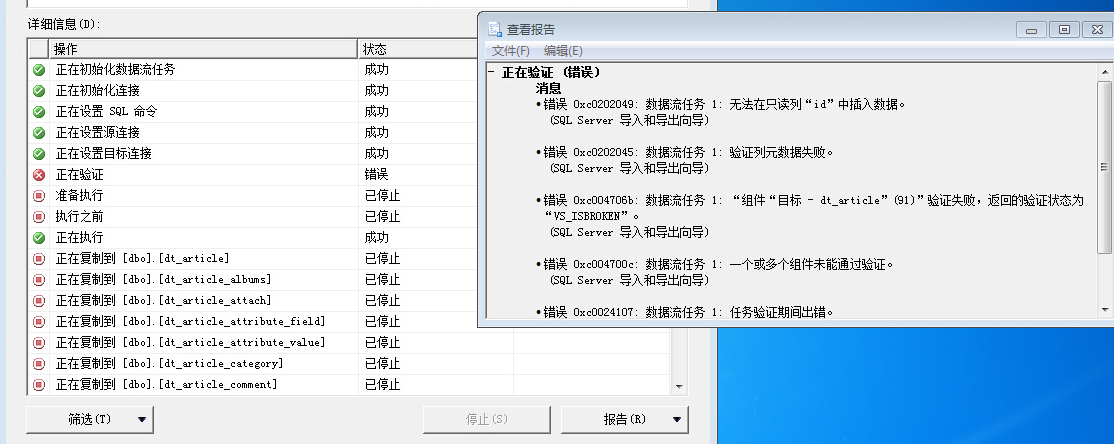 云虚拟主机mssql导入数据“数据无法插入”的报错 虚拟主机mssql导入数据报错(数据无法插入) 具体报错信息如下图所示: 原因是数据库导入时配置错误造成的,配置是 映射后没有勾选“启用标识插入”如下图所示: 可以重新导入,安装操作文档严格执行就可以了, 如果问题未解决,请联系阿里云售后 上一条: Access数据库升级到MSSQL2005数据库的步骤 下一条: 数据库技术:冲突情况与隔离级别