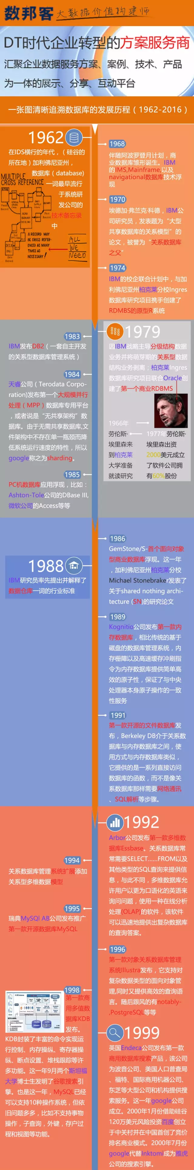 "数据库”起源于20世经90年代,美国为了战争的需要,需要把各种情报收集在一起,存储隐藏在计算机内,叫做Data Base(DB)。但是当人们追溯数据库的发展历程(1962-2016年)时,就会发现新的技术成果总是在不断丰富人们的生活,而且从来没有减速的趋势!