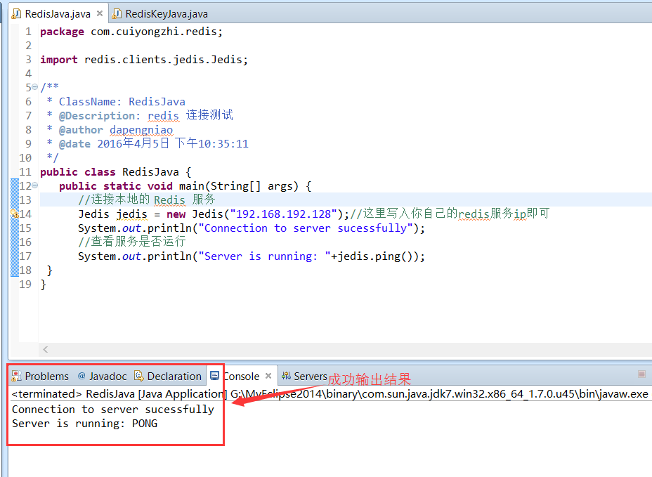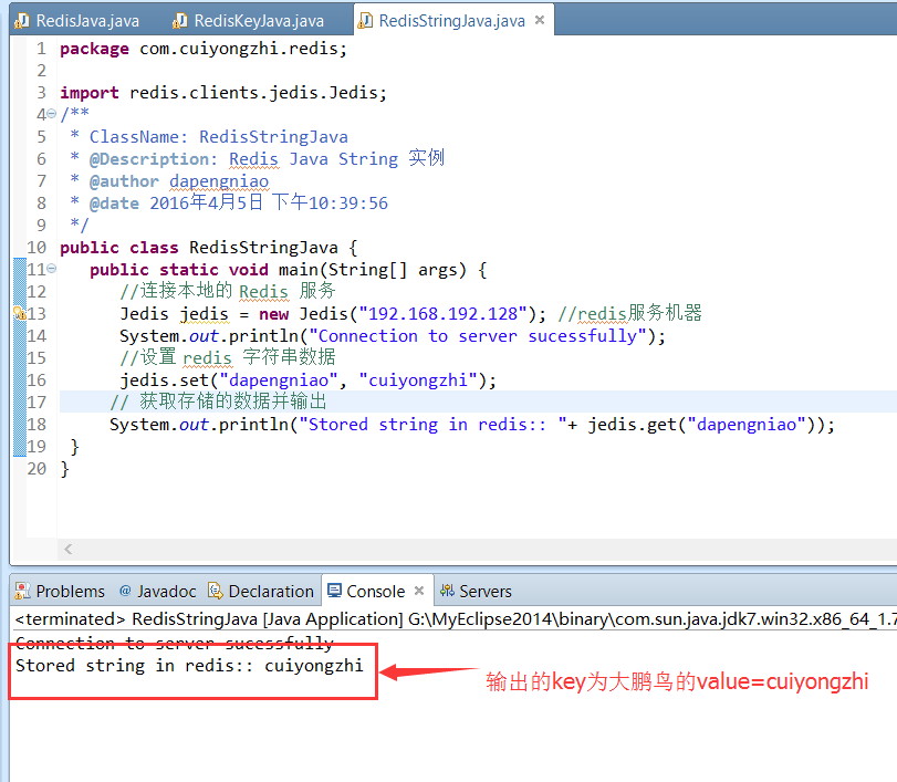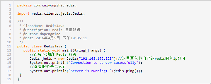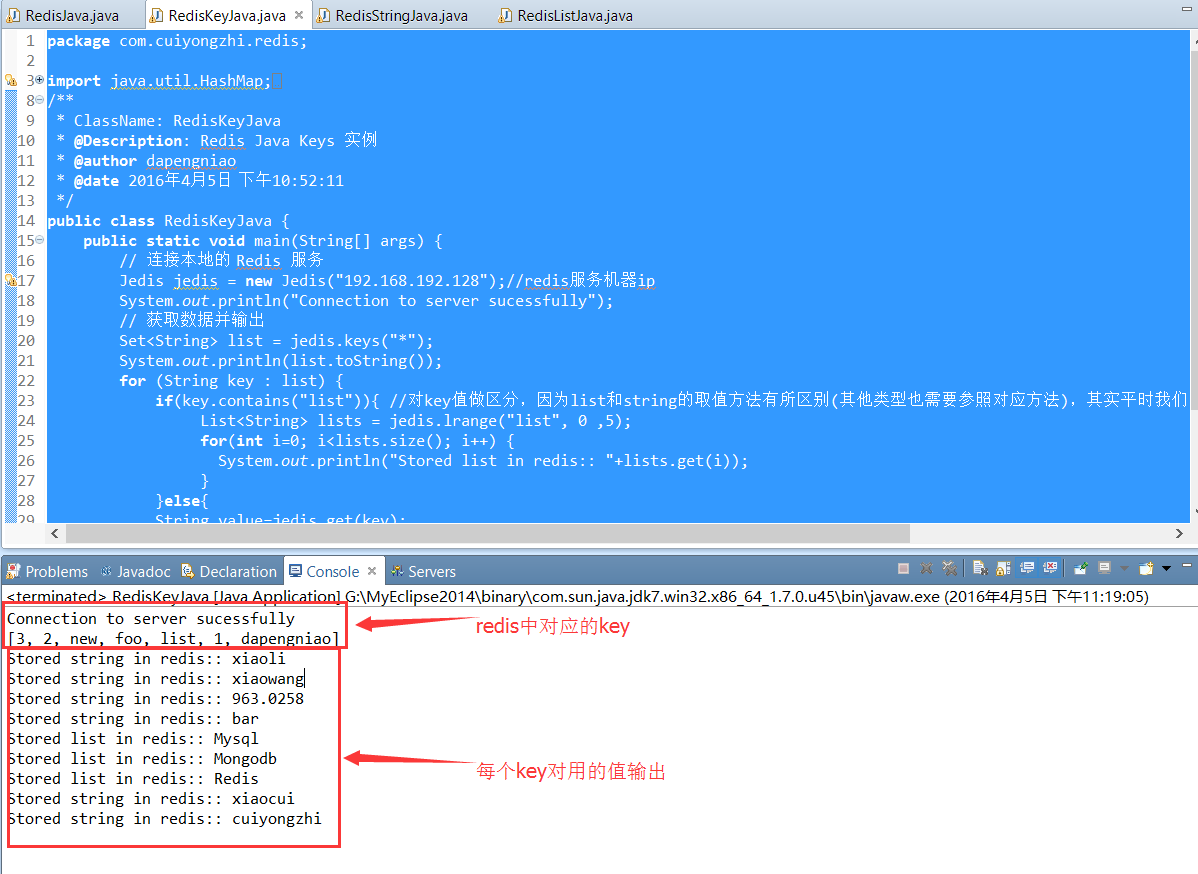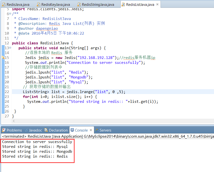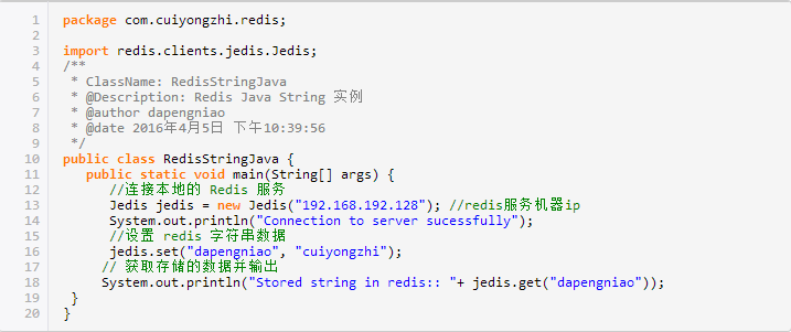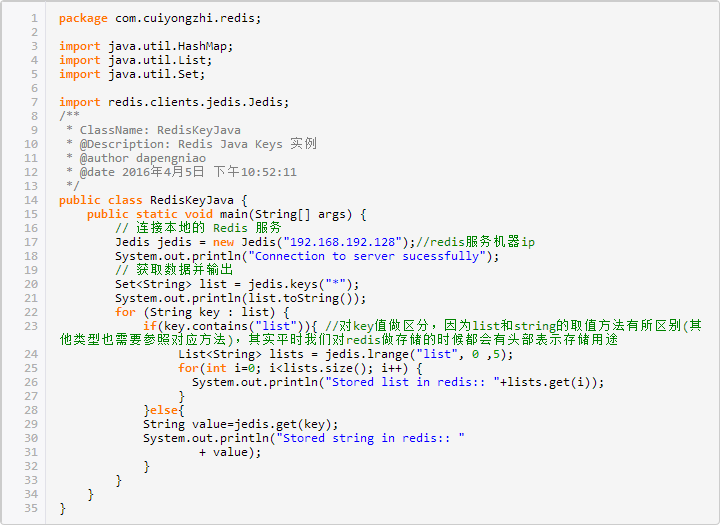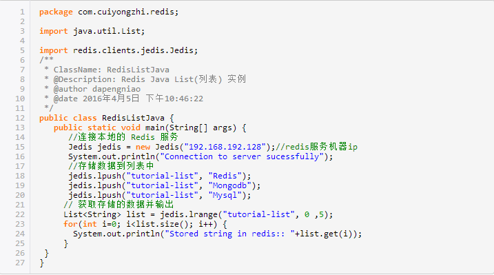 Java客户端对Redis的简单实用 在前面的几篇文章中讲述了在centos中对【Redis的介绍以及安装】:http://www.cuiyongzhi.com/index.php/post/61.html 和【Redis启动项Config的配置】:http://www.cuiyongzhi.com/index.php/post/62.html,所以在这里带来的就是在Java中对Redis的基本操作! 开始在Java中使用 Redis 前,我们需要确保已经安装了 redis 服务并处于开启状态(如上图所示)及 Java redis 驱动,redis的依赖可以到这里下载:http://pan.baidu.com/s/1kVhGTPd ,同时还需要将我们下载的jar包导入到我们的java项目中,这里我就是新建的一个简单的java项目测试的,首先让我们从java连接Redis服务开始吧,同时之前我们有说道Redis是支持多数据类型的,所以在这里我们可以尝试多数据类型的存储和读取操作! ①Java连接到Redis服务,如下所示: 运行以上代码如果redis服务是开启并且连接成功的话会如下所展示: ②Redis存储读取String(字符串) 实例 以上代码通过set的方法将key为dapengniao、value为cuiyongzhi的String类型键值对存入到redis中,后面采用get方法通过key获取并输出,最终结果如下所示: ③Redis存储读取List(列表) 实例 在上面示例②中存入和输出的是String字符串,为了展示redis的支持存储的多样性,所以这里我展示的是对列表List的存储和获取,最终运行结果如下: ④Redis读取所有Keys 实例 这里的方法做了几件事情:1、查找redis里面所有存在的key;2、对key对应的值做类型区分;3、取出key对应的value值输出;在这里值得注意的是2和3这两步,在代码中也有注释,需要注意的就是对value类型不同采用不同的取值方式,最终可以看到现在在我redis缓存了那些数据如下: 到这里就对简单的java for redis的用法就有了一个了解。 上一条: MongoDB得名的过程 下一条: SQL Server安全:数据加密