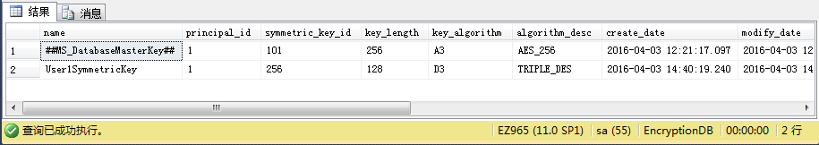 数据库主密匙保存2次:服务主密匙加密一次并保存,用你提供的密码再次加密。你可以移除其中一个,但不能同时移除。通常我们都2个都保留。 作为对称密匙,数据库主密匙在你使用它之前必须打开。打开密匙把它载入内存并解密它,这样就可以使用了。因为服务器的服务主密匙加密数据库主密匙,SQL Server可以Wie你自动打开密匙,这样的话你基本不需要直接打开它。想服务主密匙,你可以备份和还原它,想要的话也可以修改它。 你会使用插图8.1里的其它密匙来加密数据。箭头表示你用来加密和保护其它密匙的密匙。例如,你可以使用数据主密匙来加密其它证书或对称密匙。证书和非对称密匙只能保护对称密匙,对称密匙可以被证书,非对称密匙和其它对称密匙保护。 密匙管理 插图1展示了加密密匙的其它方面:你可以使用任何另一个密匙或密码来创建任何密匙。这个称为密匙管理,这是SQL Server可以为你处理一个主要服务。 密匙管理最困难的一部分选择正确的加密。历史上有很多密匙被拦截后,有很多国家秘密被破解。在二战期间,美国、英国以及其它联盟国家把大量资源放入截取德国和日本的加密密匙,这样的话,他们可以截取并得到高机密的信息。在最近,很多安全性的应用程序被瓦解,因为攻击能找到在应用程序里或电脑上嵌入的密匙。安全共享秘密非常困难。 你可以自己管理SQL Server加密密匙,如果你选择使用密码,那秘密保存好密匙就是你的责任。大多数人不想这样做,因为它需要高度专业的技术技能。但如果你想承担任务,当你创建密匙时直接使用密码选项。密码就是基本的密匙,你要确保你可以安全的地方保存这个密匙,当你需要它的时候,可以密码传输它。 但你没必要处理这些细节,因为SQL Server会为你管理好密匙。它会为你加密新的密匙,使用你指定的任何方法作为CREATE语句的一部分,安全保存数据如同它保存任何敏感信息。 你有管理密匙的选项,但没事就不要乱动。 加密数据 现在我们来看一个在SQL Server里加密的一个例子。在这个场景里,Customer表有一些客户的常规信息。一些信息,例如客户名称和它们所在的城市,不是敏感的数据,不值得加密。其它数据,例如信用卡类型和号码及备注会包含特定敏感的个人信息,需要加密。 你会使用对称密匙来加密表的数据,但记住对称密匙需要数据库里一个证书或非对称密匙来保护它。因此,首先使用代码8.2来创建保护对称密匙的非对称密匙。 1 CREATE ASYMMETRIC KEY User1AsymmetricKey 2 AUTHORIZATION User1 3 WITH ALGORITHM = RSA_2048 代码8.2:创建使用RSA 2048位算法,属于User1的非对称密匙。 非对称密匙称为User1AsymmetricKey,AUTHORIZATION子句指定User1拥有密匙。这个密匙使用2048位的RSA加密,非常强的加密。这个必须是真的,真的重要数据! 接下来,使用代码8.3出阿健对称密匙User1SymmetricKey。(你必须为你的密匙取更有描述性的名称!)。在这个例子里,它使用TRIPLE_DES算法,用你刚创建的非对称密匙保护它。 1 CREATE SYMMETRIC KEY User1SymmetricKey 2 WITH ALGORITHM = TRIPLE_DES 3 ENCRYPTION BY ASYMMETRIC KEY User1AsymmetricKey; 代码8.3:创建使用Triple DES算法的对称密匙,用刚才的非对称密匙。 如果你想在数据库列出对称的加密密匙,你可以使用sys.symmetric_keys目录视图来查看它们。代码8.4生成了如插图8.2所示的结果。注意,因为数据库主密匙是对称密匙,他在列表里也显示了,你可以看到它用AES_256加密的。 1 SELECT * FROM sys.symmetric_keys; 代码8.4:在数据库列出对称密匙 插图2:查看 sys.symmetric_keys目录视图 代码8.5展示了EncryptionDB数据库里的表结构。(这个创建表的代码和刚才初始化环境代码是一样的):