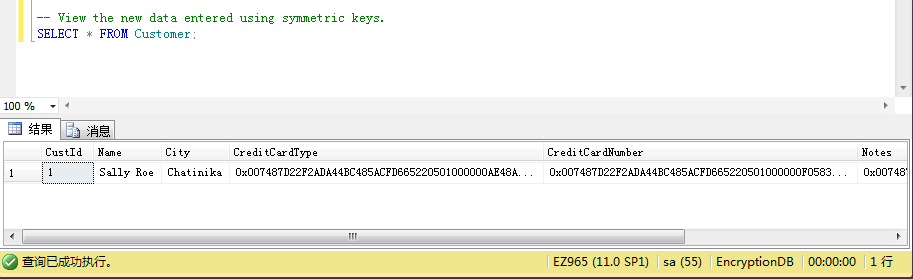 代码8.5:创建Customer表,varbinary字段用来加密数据。 注意,因为最后三个字段会包含字节流的原始字符数据的加密数据,字段类型是varbinary类型。字段长度取决于数据的大小和保护它的算法。数据库有User1用户,它在表上有SELECT和INSERT许可。 最后,是时候加密一些数据了,我们忘表里插入一些数据。第一步使用如代码8.6的语句打开对称密匙。这一步让SQL Server从内部获得密匙,请确定用户有用这个密匙的许可,然后解密密匙到内存就可以开始使用了。 1 OPEN SYMMETRIC KEY User1SymmetricKey 2 DECRYPTION BY ASYMMETRIC KEY User1AsymmetricKey; 代码8.6:第一步使用对称密匙,使用OPEN SYMMETRIC KEY打开它 数据加密使用T-SQL的EncryptByKey函数,它生成唯一的GUID来标识密匙。你可以使用Key_GUID函数来获得GUID,而不必自己直接传入值。代码8.7是常规的T-SQL插入语句,往表里插入一些数据。 1 INSERT INTO Customer VALUES (1, 'Sally Roe', 'Chatinika', 2 EncryptByKey(Key_GUID('User1SymmetricKey'), 'Visa'), 3 EncryptByKey(Key_GUID('User1SymmetricKey'), '1234-5678-9009-8765'), 4 EncryptByKey(Key_GUID('User1SymmetricKey'), 5 'One of our best customers. Treat like royalty.')); 代码8.7:插入加密数据到表,使用EncryptByKey和Key_GUID函数。 最后一步是关闭对称密匙,使用代码8.8。这个会从内存移除密匙,释放这些资源给其它用户。你应该经常在用完后就关闭密匙,因为它留在内存里的话,就会被不小心被攻击者利用。 1 CLOSE SYMMETRIC KEY User1SymmetricKey; 代码8.8:CLOSE SYMMETRIC KEY语句关闭密匙,从内存中移除它。 提示: 如果你要在批处理里使用加密与解密很多数据,可以留着它打开。打开和关闭密匙需要一点处理,这样的话你可以更高效。但不要忘记关闭它在你完成的时候! 现在运行SELECT语句看看表里有什么,如插图3所示。你可以看到在没加密字段看到明文,但加密字段是随机的字节流数据。你的数据现在是安全的! 插图3:在表里存储的加密数据。 在表里的数据是毫无用处的,除非有方法取出它。在这个例子里,你需要使用常规的SELECT语句,使用DecryptByKey函数来解密数据。这个函数返回varbinary数据,以为加密数据可以是任何数据类型。因此获得原始文本需要DecryptByKey函数的转化结果为合适的文本字符。 代码8.9打开密匙,运行SELECT语句。