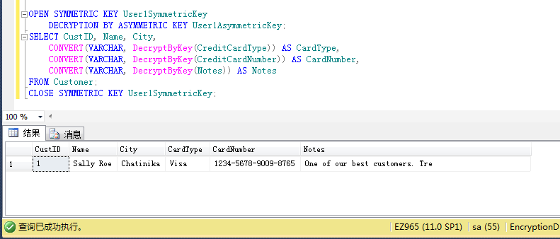 1 OPEN SYMMETRIC KEY User1SymmetricKey 2 DECRYPTION BY ASYMMETRIC KEY User1AsymmetricKey; 3 SELECT CustID, Name, City, 4 CONVERT(VARCHAR, DecryptByKey(CreditCardType)) AS CardType, 5 CONVERT(VARCHAR, DecryptByKey(CreditCardNumber)) AS CardNumber, 6 CONVERT(VARCHAR, DecryptByKey(Notes)) AS Notes 7 FROM Customer; 8 CLOSE SYMMETRIC KEY User1SymmetricKey;