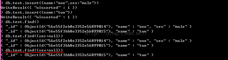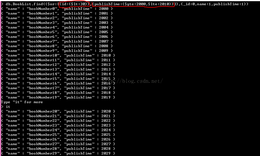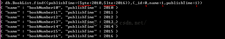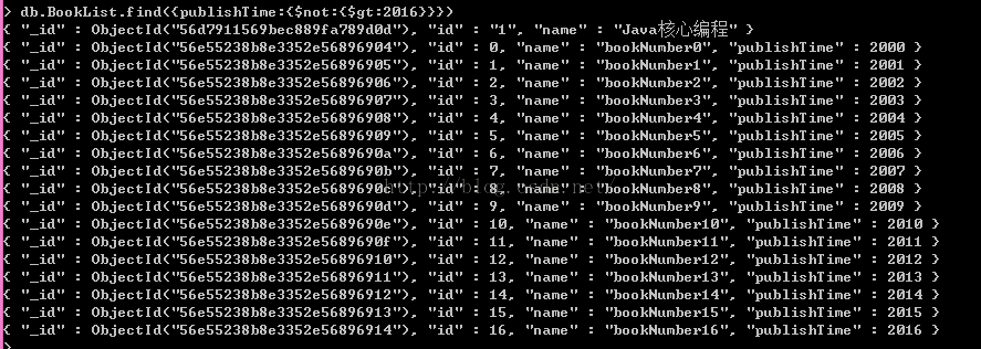 MongoDB学习(6):MongoDB的find查询比较符 首先,先通过以下函数向BookList集合中插入10000条数据,如下所示: function insertN(obj,n){ var i=0; while(i obj.insert({id:i,name:"bookNumber"+i,publishTime:i+2000}) i++; } } var BookList=db.getCollection("BookList") 调用函数,这样,BookList中就有10000条数据了 通过命令db.[documentName].find({条件},{键指定})来查询具有特定特征的数据,键指定可用于指定什么键显示想、什么键不显示。比如:{id:0,name:1,publishTime:1}表示id键内容不显示,name与publishTime内容显示。 一,比较操作符查询 $lt (less than)< $lte (less than equal)<= $gt (greater than)> $gte (greater than equal)>= $ne (not equal)!= 我们可以运用比较操作符来查询出出版日期publishTime在2010年至2016年的书,并且不会显示id,那么我们可以用以下语句来进行查询 db.BookList.find({publishTime:{$gte:2010,$lte:2016}},{_id:0,name:1,publishTime:1}) 效果如下所示: 其他比较符可用类似方法组合使用。 二,$in与$nin包含与不包含 $in与$nin的用法是根据特定的键值。 命令格式db.[documentName].find({filed:{$nin:[value1,value2,...]}}),运用该命令就可以查询出键filed中不包含value1或value2,...等的数据。 命令格式db.[documentName].find({filed:{$in:[value1,value2,...]}}),运用该命令就可以查询出键filed中包含value1或value2,...等的数据,是一个或关系,只要包含有一个相同的value就符合查找条件。 三,$or或查询 命令格式db.[documentName].find({$or:[{条件},{条件},...]}),注意中括号与花括号的区别,例如我们要查询id小于30,出版日期publishTime介于2000-2010年的数据,我们就可以用命令: db.BookList.find({$or:[{id:{$lt:30}},{publishTime:{$gte:200,$lte:2010}}]},{_id:0,name:1,publishTime:1}) 四,Null关键字 Null关键字可用于查询集合中哪些数据不包含某些键,命令格式db.[documentName].find({filed:null}) 五,$not取反 这个指令可将任何查询条件取反,类似于查询publishTime大于2016年的,通过$not取反可取到publishTime小于等于2016年的,一下为指令变换: db.BookList.find({publishTime:{$gt:2016}}) 取反 db.BookList.find({publishTime:{$not:{$gt:2016}}}) 六,正则表达式查询 命令格式db.[documentName].find({filed:正则表达式})。 下一条: Redis的基础教程