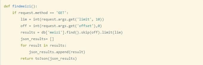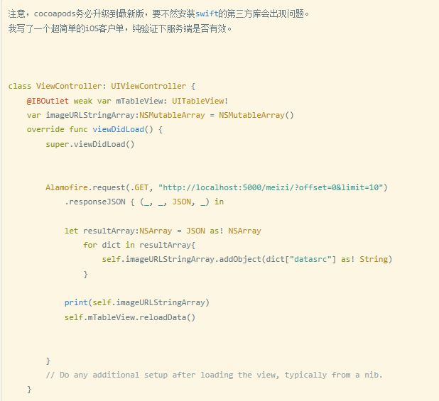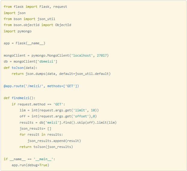 Scrapy+Flask+Mongodb+Swift开发全攻略二 一、准备工作 好的,在这篇攻略开始之前,先要干两件事。第一件事是找到spiders文件夹里的dbmeizi_scrapy.py。打开它,在上一篇攻略里,这个爬虫文件是这么写的,代码为图1所示: 图1 现在我们需要改成这样,代码如图2所示: 图2 原因很简单,与mssql不同,由于用extract这个方法得到的是一个数组,而我们的每一个字段实际上是一个string并非是一个array,若不取第一个值,那么存入mongodb之后,title这个key对应的value是一个数组,这会导致我们将mongodb里的数据转换成json之后需要在客户端再进行分解。这样操作起来很麻烦。 第二件要做的事,是删除我们上一个爬虫爬取的数据。 如图3: 图3 好了,再次运行我们的爬虫,scrapy crawl dbmeiziSpider,再检查一下数据库里的内容,是不是以前的每个字段对应的内容已经从数组变成了string了。如图4所示: 图4 二、开始编写服务器 现在我们要从iOS程序员变成一个菜鸟级别的server端选手。不过能用自己编写的iOS客户端从自己写的server下载数据,也是挺好的 在编写服务器端的时候确保你用pip安装了下面的两个库。 1.pymongo 2.Flask 我们的服务端代码如图5所示: 图5 图5所示的代码就是我们的服务端代码,虽然只有短短28行,python的强大之处也在于此。 接下来让我来一行一行的解释一下。 前面5行就是import各种我们需要的库,若后面你使用python server.py运行的时候提示错误,很可能是你的机子上缺少上述的库。 app = Flask(__name__)这句话就是利用Flask的构造方法生成一个Flask实例,name是什么?简单来说,你创建的任何python文件(.py),都会有一个内置属性,叫做__name__,他有两个用途,如果你在命令行状态下直接运行`python .py`的时候,这个时候这个python文件里的__name__就是__main__,如果你是在别的python文件里import *.py,那么这个name的东西就是这个Python文件的文件名。so,这个东西常常用来判断,你是在import还是直接在命令行里运行这个文件。 因此在上一行,我们生成了一个Flask实例并且把这个实例赋给了app这个变量。 mongoClient = pymongo.MongoClient('localhost', 27017) db = mongoClient['dbmeizi'] 这两句很简单,就是用pymongo这个第三方库,打开我们的mongodb数据库,并且拿到我们的dbmeizi这个database。 def toJson(data): return json.dumps(data, default=json_util.default) 这句话,我们定义了一个函数,用来把mongodb里的数据转换为json格式。用来返回给我们的ios客户端。 @app.route('/meizi/', methods=['GET']) 这句话的意思就是Flask的一种写法,意思就是当我们发起了一个request,并且这个request的方法是get,url是"localhost:5000/meizi/"这种的的时候,我们就执行findmeizi()这个方法。如图6所示: 图6 这个方法就是我们的http server监测到用户发起get请求,并且URL是形如'http://127.0.0.1:5000/sightings/?offset=0&limit=3'的时候,我们取出limit这个值,赋给lim这个变量,然后取出offset这个值,赋给off。 然后呢?利用我们的db(就是刚才利用pymongo获取的mongodb实例),取出‘meizi’这个collection,skip(off)的意思就是跳过前面多少行,limit(lim)表示从数据库取出多少个值。 整句话的意思就是,从meizi这个collection里跳过前off个值,取后面的lim个值。 现在取到的数据都在results变量里,跟mssql一样,了解mssql的都知道。我们遍历results,放入json_results这个数组里,然后把数组转换成json格式返回给客户端。 我们运行一下试试。如图7所示 图7 图7所示的结果数据已经返回给浏览器了。 这时候我们编写一个简单的iOS客户端,验证一下。 我们建立一个swift的iOS程序,用cocoapods安装下列库。如图8的代码所示: 图8 请注意,cocoapods务必升级到最新版,要不然安装swift的第三方库会出现问题。 我写了一个超简单的iOS客户单,纯验证下服务端是否有效。如下面的代码所示: 图9 图10 运行一下上面所示的代码。 图11 如图11的显示结果,数据返回正确。 但是,这样还远远没有结束,爬虫完全是个半成品,服务端简直就是个玩笑,客户端什么炫酷特效交互都没有,做这样的东西简直是打自己的脸。