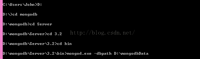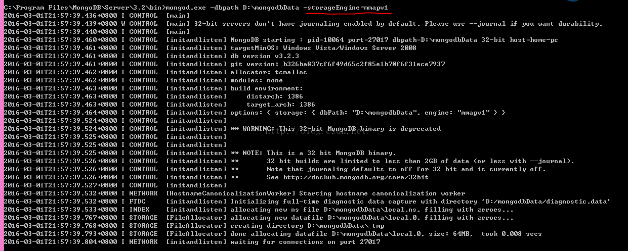 MongoDB学习(1):安装时出现The default storage engine 'wiredTiger' is not available问题 MongoDB是NoSql类型的一种基于分布式文件存储的数据库,它的存储方式与关系型数据库不意义。安装文件可从官网下载,官网地址:http://mongodb.org 将下载的解压文件放到D盘的mongodb文件夹下,如下图所示: bin目录中就有操作所需的各个文件,在命令行中cd到bin目录下,输入: mongod.exe --dbpath D:\mongodbData (你的数据库数据存放目录) 指定你数据存放位置,如下所示: 回车时如果出现下面所示的问题: C:\Program Files\MongoDB\Server\3.2\bin>mongod.exe -dbpath D:\mongodbData 2016-03-01T21:51:39.279+0800 I CONTROL [main] 2016-03-01T21:51:39.281+0800 W CONTROL [main] 32-bit servers don't have journaling enabled by default. Please use --journal if you want durability. 2016-03-01T21:51:39.282+0800 I CONTROL [main] 2016-03-01T21:51:39.303+0800 I CONTROL [initandlisten] MongoDB starting : pid=11348 port=27017 dbpath=D:\mongodbData 32-bit host=home-pc 2016-03-01T21:51:39.303+0800 I CONTROL [initandlisten] targetMinOS: Windows Vista/Windows Server 2008 2016-03-01T21:51:39.304+0800 I CONTROL [initandlisten] db version v3.2.3 2016-03-01T21:51:39.304+0800 I CONTROL [initandlisten] git version: b326ba837cf6f49d65c2f85e1b70f6f31ece7937 2016-03-01T21:51:39.305+0800 I CONTROL [initandlisten] allocator: tcmalloc 2016-03-01T21:51:39.305+0800 I CONTROL [initandlisten] modules: none 2016-03-01T21:51:39.305+0800 I CONTROL [initandlisten] build environment: 2016-03-01T21:51:39.306+0800 I CONTROL [initandlisten] distarch: i386 2016-03-01T21:51:39.306+0800 I CONTROL [initandlisten] target_arch: i386 2016-03-01T21:51:39.307+0800 I CONTROL [initandlisten] options: { storage: { dbPath: "D:\mongodbData" } } 2016-03-01T21:51:39.310+0800 I STORAGE [initandlisten] exception in initAndListen: 28663 Cannot start server. The default storage engine 'wiredTiger' is not available with this build of mongod. Please specify a different storage engine explicitly, e.g. --storageEngine=mmapv1., terminating 2016-03-01T21:51:39.310+0800 I CONTROL [initandlisten] dbexit: rc: 100 这是存储引擎出现错误,就是默认的存储引擎(default storage engine)原本为wiredTiger,wiredTiger这个存储引擎不适合mongodb,所以mongodb无法使用,当然就没有办法建立数据存储路径,将存储引擎换成mmapv1就可以了: 然后再将bin所在的路径添加到系统路径中,以后要使用mongodb都要先启动,即先执行mongod.exe,我们只要把 mongod.exe -dbpath D:\mongodbData -storageEngine=mmapv1 写到一个bat文件里就可以了,若是要使用mongo的shell,则执行mongo.exe就可以了,当然也可以将mongo.exe写到一个bat文件中,如下所示: 这样点击这两个文件就行了。 下一条: nodejs+redis应用说明