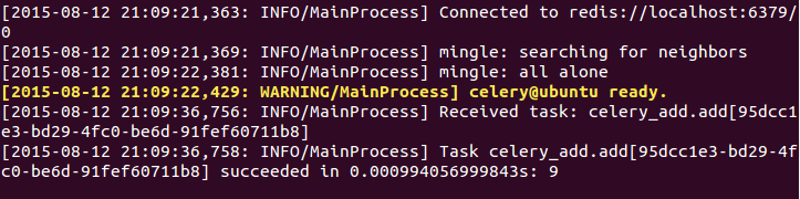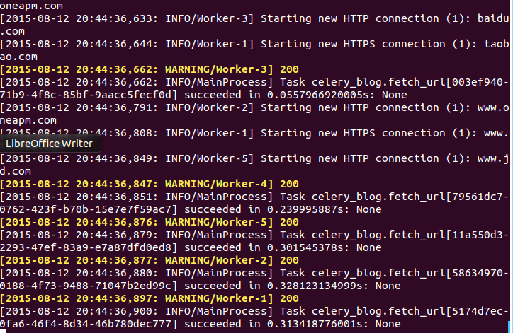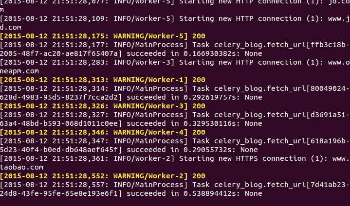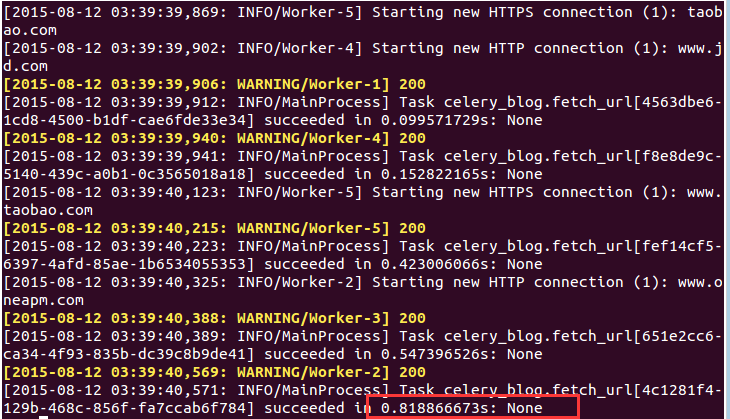 可以看到第二个终端输出如图2所示: 2.3 将 celery 代码与配置保存在不同文件中 从上面的例子中,我们只写了一个 celery 任务。但是您的项目可能涉及多个模块,您可能希望在不同的模块中有不同的任务。因此让我们将 celery 配置移到单独的文件中。 创建 celery_config.py from celery import Celery app = Celery('celery_config', broker='redis://localhost:6379/0', include=['celery_blog']) 修改 celery_blog.py 代码如下所示: import requests from celery_config import app @app.task def fetch_url(url): resp = requests.get(url) print resp.status_code def func(urls): for url in urls: fetch_url.delay(url) if __name__ == "__main__": func(["http://oneapm.com", "http://jd.com", "https://taobao.com", "http://baidu.com", "http://news.oneapm.com"]) 停掉之前的 celery worker ,运行以下代码: celery worker -A celery_config -l info -c 5 打开 ipython ,运行如下所示的命令: In [1]: from celery_blog import func In [2]: func(["http://oneapm.com", "http://jd.com", "https://taobao.com", "http://baidu.com", "http://news.oneapm.com"]) 输出如图3所示: 2.4 在不同文件中添加新的任务 您可以添加新的模块,并在该模块中定义一个任务。用以下内容创建一个模块 celery_add.py,参考代码如下所示: from celery_config import app @app.task def add(a, b): return a + b 改变 celery_config.py 包含新的模块 celery_add.py,如下所示: from celery import Celery app = Celery('celery_config', broker='redis://localhost:6379/0', include=['celery_blog', 'celery_add']) 在 ipython 输入以下代码: In [1]: from celery_add import add In [2]: add.delay(4, 5) 输出如图4所示: 三、在不同的机器上分开使用 Redis 与 celery 目前为止,我们的脚本celery worker 与Redis 都运行在同一机器中。其实并无这种必要,这三者可以运行在不同机器上。 celery 任务涉及到网络请求,所以,在网络优化的机器上使用 celery worker 能提高任务运行速度。Redis 是一种内存数据库,在内存优化的机器上运行效率更高。 在上面的例子,我将在本地系统运行脚本和 celery worker,在分开的服务器上运行 Redis。 修改 celery_config.py 为以下代码: app = Celery('celery_config', broker='redis://192.168.118.148:6379/0', include=['celery_blog']) 现在我运行任何任务,脚本都将把他放在 Redis 运行的服务器(192.168.118.148)上面。 celery worker 也同 192.168.118.148 沟通,在这个 Redis 服务器上得到任务并执行它。 请注意:您必须使用正在运行 redis-server 的服务器地址。我的服务器已停止Redis,所以你将无法连接到 Redis。 以后会更新关于mssql的文,关注mssql的朋友请期待。 参考文章:Getting started with Celery and Redis 上一条: 数据库连接池的理解与使用