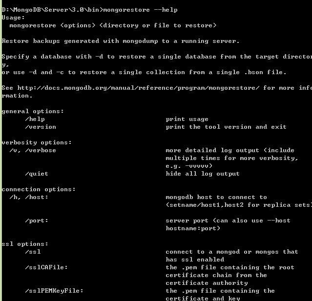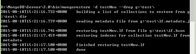 需要注意一点的是,mongodump备份时的查询会对其他客户端的性能产生影响。 更多的操作我们可以通过mongodump –help来查询 二、mongorestore 下面我们来介绍如何用mongorestore来恢复数据。 mongorestore获取mongodump 的输出结果,并将备份的数据插入运行的MongoDB实例中。和mongodump一样,mongorestore也是一个独立的客户端,如图6所示: 使用该方法,将刚才备份的lf集合放到新的数据库testNew中去,如图7所示: