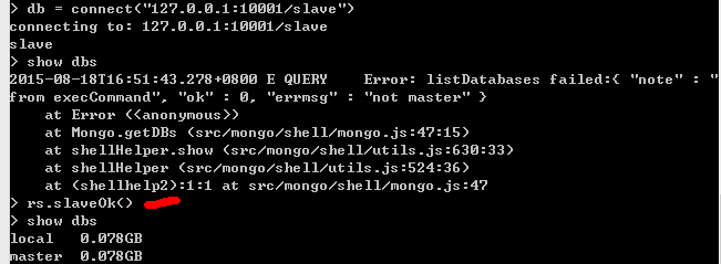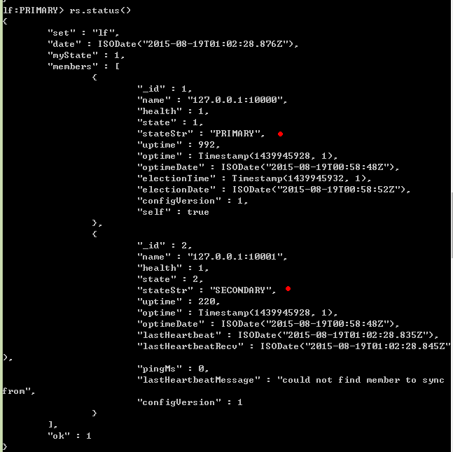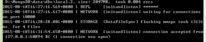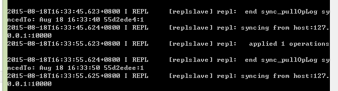 上面所示的说明数据恢复成功 可以使用mongorestore –help获得帮助信息 需要注意的是,这两个命令操作的都是bson格式的数据,当数据量很大,超过几百G的时候,几乎是不能使用的,因为bson极其占用空间,(与mssql类似) 三、fsync锁 说到mongodump备份,就不能不提到fsync和锁了。我们刚刚提到过,使用mongodump备份可以不关闭服务器,但却失去了获取实时数据视图的能力。而MongoDB的fsync命令能够在MongoDB运行时复制数据目录还不会损坏数据。 其工作原理就是强制命令服务器将所有缓存区写入磁盘,通过上锁阻止对数据库的进一步写入操作,直到释放锁为止。写入锁是让fsync在备份时发挥作用的关键。 在shell中,强制执行fsync并获得写入锁,如下面所示: db.runCommand({"fsync":1,"lock":1}) 这时,数据目录的数据就是一致的,且为数据的实时快照.由于上了锁,可以安全的将数据目录副本作为备份。要是数据库运行在有快照功能的文件系统上时,比如LVM,EBS,这个很有用,因为拍个数据库目录的快照很快。 备份好了,解锁,如下所示: db.$cmd.sys.unlock.findOne() db.currentOp() 运行db.currentOp()是为了确保已经解锁了(初次请求解锁会花点时间)。 有了fsync命令,就能非常灵活的备份,不用停掉服务器,也不用牺牲备份的实时性能。要付出的代价就是一些写入操作被暂时阻塞了。 四、主从复制 上面提到的备份方式很灵活,但是还是没有从服务器上备份好,当复制的方式运行MongoDB,前面的提到的备份技术就不仅能用在主服务器上,也可用在从服务器上。主从复制是MongoDB最常用的复制方式,这种方式很灵活,可以用于备份、故障恢复与读扩展等。 最基本的设置方式:建立一个主节点和一个或多个从节点,每个从节点要知道主节点的地址。 我们通过mongod --master启动主服务器,通过运行mongod --slave --source master_address启动从服务器,其中master_address的主节点的地址。 这里我们用一台机器的不同端口来做测试: 首先,给主节点建立数据目录,如下所示: mongod --dbpath "D:\MongoDB\data\dbs " --port 10000 --master 创建成功后,如图12所示: 然后,我们设置从节点,如下所示: mongod --dbpath "D:\MongoDB\data\dbs\slave " --port 10000 --slave --source 127.0.0.1:10000 创建后,其自动开始监听主节点的端口,如图14所示: 连接到主数据库: db = connect(“127.0.0.1:10000/master”) 向主节点服务器添加数据,如图16所示: 再连接从节点,从节点查询数据.如图17所示: 注意如果报错,需要使用rs.slaveOk()方法。 从节点中数据与主节点一致,说明备份成功。所有的从节点都会和主节点保持同步,一个集群中最好不要超过12个从节点。 五、选项 主从复制的过程中有一些配置选项,如下所示: –only 在从节点上指定只复制特定的某个数据库(默认是复制所有数据库),如下所示: –slavedelay 用在从节点上,当应用主节点的操作时,从节点增加延时复制(单位秒)。这样就能轻松设置延时从节点,这种节点对用户无意中删除重要文档或者插入垃圾数据等有防护作用,这些不良操作都会被复制到所有的从节点上,通过延时执行操作,可以有个恢复的时间差。如下所示: –fastsync 以主节点的数据快照为基础启动从节点。如果数据目录一开始是主节点的数据快照,从节点用这个选项启动要比做完整的同步快的多。如下所示: –autoresync 如果从节点与主节点不同步了,则自动重新同步,如下所示: –oplogsize 主节点oplog的大小(单位MB)如下所示: 六、副本集 最后来说说副本集,副本集就是有自动故障恢复功能的主从集群。副本集合主从集群的区别就是副本集中没有固定的主节点。 整个集群会选举出一个活跃节点,当其不能工作时,就会使其他备份节点变为活跃节点。也即是说,副本集总会有一个活跃节点(primary)和一个或多个备份节点(secondary)。 七、初始化 设置副本集比设置主从集群稍微复杂一点,因为它需要初始化。还得给副本集取一个名称,区别于其他副本集(如mssql)。这里取名lf。 首先启动一个节点: mongod --dbpath "D:\MongoDB\Server\3.0\bin\master" --port 10000 --replSet lf/127.0.0.1:10001 这里的–replSet的作用是让服务器知道这个lf副本集还有别的同伴位置在 lf/127.0.0.1:10001 接下来以同样的方式启动另一台,如下所示: mongod --dbpath "D:\MongoDB\Server\3.0\bin\slave" --port 10000 --replSet lf/127.0.0.1:10000 如果想要添加第三台,两种方式,如下所示: mongod --dbpath " D:\MongoDB\Server\3.0\bin\slave 1" --port 10002 --replSet lf/127.0.0.1:10000 或是 mongod --dbpath " D:\MongoDB\Server\3.0\bin\slave1" --port 10002 --replSet lf/127.0.0.1:10000,127.0.0.1:10001 两种方式都可以是由于副本集有自动检测功能,在其中指定单台服务器后,MongoDB就会自动搜索并连接其余的节点。 然后就是初始化操作了,在shell脚本中初始化副本集,如下所示: use admin db.runCommand( { "replSetInitiate": { "_id":"lf",//副本集的名称 "members"://副本集中的服务器列表 [ { "_id":1,//每个服务器的唯一id "host":"127.0.0.1:10000"//指定服务器的主机 }, { "_id":2, "host":"127.0.0.1:10001" } ] } } )