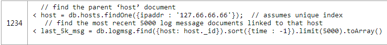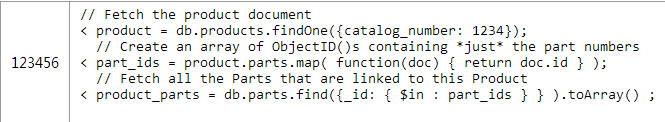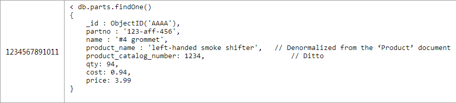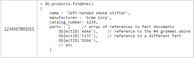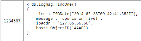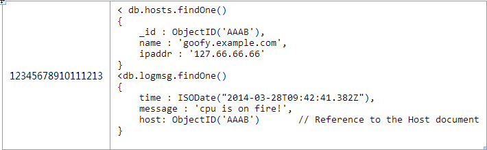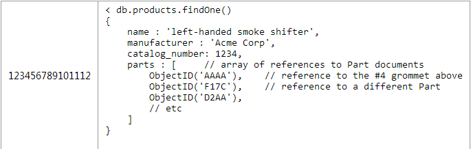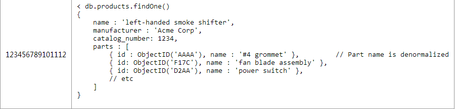 例如,如果你是在对一个任务跟踪系统进行建模,每个用户将会被分配若干个任务。内嵌这些任务到用户文档在遇到“查询昨天所有的任务”这样的问题时将会非常困难。我会在下一篇文章针对这个用例提供一些适当的设计。 Basics: One-to-Many 2.一对许多 以产品零件订货系统为例。每个商品有数百个可替换的零件,但不会超过数千个。这个用例很适合使用间接引用---将零件的objectid作为数组存放在商品文档中(在这个例子中的ObjectID我使用更加易读的2字节,现实世界中他们可能是由12个字节组成的)。 每个零件都将有他们自己的文档对象,如图2所示: 每个产品的文档对象中parts数组中将会存放多个零件的ObjectID,如图3所示 : 在获取特定产品中所有零件,需要一个应用层级别的join 为了能快速的执行查询,必须确保products.catalog_number有索引。当然由于零件中parts._id一定是有索引的,所以这也会很高效。 这种引用的方式是对内嵌优缺点的补充。每个零件是个单独的文档,能很容易的独立去搜索和更新他们。需要一条单独的语句去获取零件的具体内容是使用这种建模方式需要考虑的一个问题(请仔细思考这个问题,在第二章反反范式化中,我们还会讨论这个问题) 这种建模方式中的零件部分可以被多个产品使用,所以在多对多时不需要一张单独的连接表。 Basics: One-to-Squillions 3.一对非常多 我们用一个收集各种机器日志的例子来讨论一对非常多的问题。由于每个mongodb的文档有16M的大小限制,所以即使你是存储ObjectID也是不够的。我们可以使用很经典的处理方法“父级引用”---用一个文档存储主机,在每个日志文档中保存这个主机的ObjectID。如图4所示: 以下是个和第二中方案稍微不同的应用级别的join用来查找一台主机最近5000条的日志信息,如图5所示: 所以,即使这种简单的讨论也有能察觉出mongobd的建模和关系模型建模的不同之处。你必须要注意一下两个因素: Will the entities on the “N” side of the One-to-N ever need to stand alone? 一对多中的多是否需要一个单独的实体。 What is the cardinality of the relationship: is it one-to-few; one-to-many; or one-to-squillions? 这个关系中集合的规模是一对很少,很多,还是非常多。 Based on these factors, you can pick one of the three basic One-to-N schema designs: 基于以上因素来决定采取以下三种建模的方式