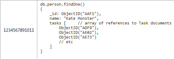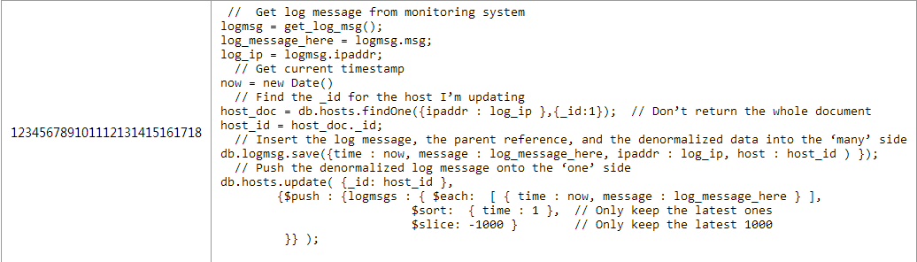 在掌握了以上基础技术后,我将会介绍更为高级的主题:双向关联与反范式化。 1.双向关联 若你想让你的设计更酷,你可以让引用的“one”端与“many”端同时保存对方的引用。 以上一篇文章讨论过的任务跟踪系统为例。有person与task两个集合,one-to-n的关系是从person端到task端。在需要获取person所有的task这个场景下需要在person这个对象中保存有task的id数组,如图6所示的代码。 在某些场景中这个应用需要显示任务的列表(例如显示一个多人协作项目中所有的任务),为了能够快速的获取某个用户负责的项目可以在task对象中嵌入附加的person引用关系。如图7所示: 这个方案具有所有的一对多方案的优缺点,但是通过添加附加的引用关系。在task文档对象中添加额外的“owner”引用可以很快的找到某个task的所有者,但是如果想将一个task分配给其他person就需要更新引用中的person和task这两个对象(熟悉关系数据库的童鞋会发现这样就没法保证操作的原子性。当然,这对任务跟踪系统来说并没有什么问题,但是你必须考虑你的用例是否能够容忍) 2.在一对多关系中应用反范式 在你的设计中加入反范式,能使你避免应用层级别的join读取,当然,代价是这也会让你在更新是需要操作更多数据。下面我会举个例子来进行说明 3.反范式Many -< One 以产品和零件为例,你可以在parts数组中冗余存储零件的名字。图8所示的是没有加入反范式设计的结构。 反范式化意味着你不需要执行一个应用层级别的join去显示一个产品所有的零件名字,当然如果你同时还需要其他零件信息那这个应用层的join是避免不了的。如图9所示 在使得获取零件名字简单的同时,执行一个应用层级别的join会和之前的代码有些区别,具体如图10所示: 反范式化在节省你读的代价的同时会带来更新的代价:如果你将零件的名字冗余到产品的文档对象中,那么你想更改某个零件的名字你就必须同时更新所有包含这个零件的产品对象。 在一个读比写频率高的多的系统里,反范式是有使用的意义的。如果你很经常的需要高效的读取冗余的数据,但是几乎不去变更他d话,那么付出更新上的代价还是值得的。更新的频率越高,这种设计方案的带来的好处越少。 例如:假设零件的名字变化的频率很低,但是零件的库存变化很频繁,那么你可以冗余零件的名字到产品对象中,但是别冗余零件的库存。 需要注意的是,一旦你冗余了一个字段,那么对于这个字段的更新将不在是原子的。和上面双向引用的例子一样,如果你在零件对象中更新了零件的名字,那么更新产品对象中保存的名字字段前将会存在短时间的不一致。 4.反范式One -< Many 你也可以冗余one端的数据到many端,如图11所示: 若你冗余产品的名字到零件表中,那么一旦更新产品的名字就必须更新所有和这个产品有关的零件,这比起只更新一个产品对象来说代价明显更大。这种情况下,更应该慎重的考虑读写频率。 5.在一对很多的关系中应用反范式 在日志系统这个一对许多的例子中也可以应用反范式化的技术。你可以将one端(主机对象)冗余到日志对象中,或反之。 图12所示的例子将主机中的IP地址冗余到日志对象中。 如果想获取最近某个ip地址的日志信息就变的很简单,只需要一条语句而不是之前的两条就能完成。如图13所示: 实际上,如果one端只有少量的信息存储,你甚至可以全部冗余存储到多端上,合并两个对象。如图14所示: 在另一方面,也可以冗余数据到one端。比如说你想在主机文档中保存最近的1000条日志,可以使用mongodb 2.4中新加入的$eache/$slice功能来保证list有序而且只保存1000条。 日志对象保存在logmsg集合中,同时冗余到hosts对象中。这样即使hosts对象中超过1000条的数据也不会导致日志对象丢失。如图15所示: 通过在查询中使用投影参数 (类似{_id:1})的方式在不需要使用logmsgs数组的情况下避免获取整个mongodb对象,1000个日志信息带来的网络开销是很大的。 在一对多的情况下,需要慎重的考虑读和更新的频率。冗余日志信息到主机文档对象中只有在日志对象几乎不会发生更新的情况下才是个好的决定。 三、总结 在这篇文章里,我介绍了对三种基础方案,内嵌文档,子引用,父引用的补充选择。如以下几点: