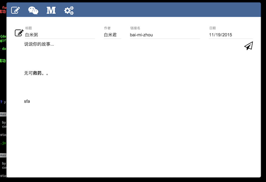 动态网页是一个要解决的难题。我们从数据库中读取数据,用动态去渲染出一个静态页面,并缓存服务器来缓存这个页面。我们都能用Squid、Varnish这样的软件来缓存页面——这就表明它们可以是静态的,那么为什么不考虑直接使用静态网页呢? 为了实现之前所说的编辑-发布-开发分离的CMS,我花了两天的时间打造了一个面向普通用户的编辑器。如图1所示: 图1 对于一个普通用户来说这是一个很简单的软件。除了Electron + Node.js + React作了一个140M左右的软件虽然打包完只有40M左右 ,但可能还是会把用户吓跑的。不过作为一个快速构建的原型已经很不错了——构建速度很快、且运行良好。 虽然这个界面看上去还是稍微复杂了一下,还在试着想办法将链接名与日期去掉——问题是为什么会有这两个东西? 一、从Schema到数据库 我们在我们数据库中定义好了Schema:对一个数据库的结构描述。之前我们说到了echeveria-content的一个数据文件,参考代码已给出,如下所示: { "title": "白米粥", "author": "白米粥", "url": "baimizhou", "date": "2015-10-21", "description": "# Blog post \n > This is an example blog post \n Lorem ipsum dolor sit amet, consectetur adipisicing elit, sed do eiusmod tempor incididunt ut labore et dolore magna aliqua. ", "blogpost": "# Blog post \n > This is an example blog post \n Lorem ipsum dolor sit amet, consectetur adipisicing elit, sed do eiusmod tempor incididunt ut labore et dolore magna aliqua. \n Ut enim ad minim veniam, quis nostrud exercitation ullamco laboris nisi ut aliquip ex ea commodo consequat. Duis aute irure dolor in reprehenderit in voluptate velit esse cillum dolore eu fugiat nulla pariatur. Excepteur sint occaecat cupidatat non proident, sunt in culpa qui officia deserunt mollit anim id est laborum." } 比起之前的直接生成静态页面这里的数据就是更有意思地一步了,我们从数据库读取数据就是为了生成一个JSON文件。那么为何不直接以JSON的形式存储文件呢? 我们都定义了这每篇文章的基本元素,如下所示:
