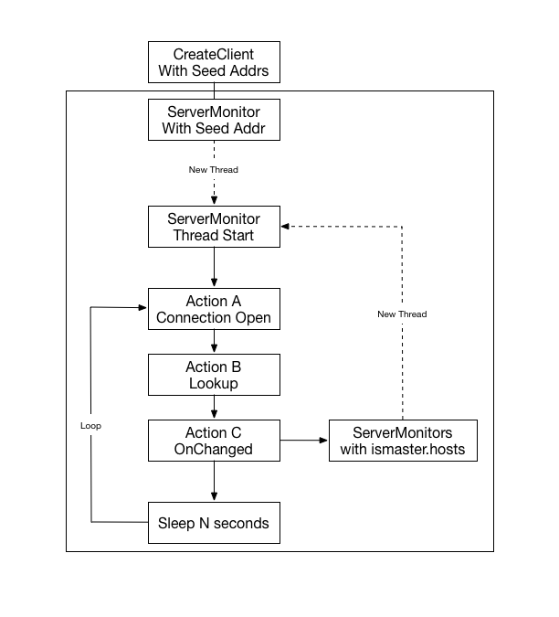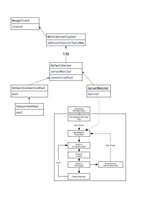 前言 Driver是MongoDB非常重要的组成部分,通过不同的配置实现Secondary访问;读写分离,动态感知集群容灾切换等功能。目前MongoDB已经覆盖了大部分的开发语言,常见的JAVA到Go,可以参考官方连接MongoDB Drivers。在这篇文章中,我们以Java版本为例介绍MongoDB的Drivers实现逻辑和协议,选择Java的原因为语言阅读门槛低,配合IDE,进行DEBUG追踪也非常容易,其次Java版本实现的功能非常完善。主要讲解的是ReplicaSet模式,因为Shard模式有mongos作为代理,没有充分体现Driver的路由逻辑。 本篇主要讲解了以下三个部分: Driver初始化 Driver请求路由 Driver容灾处理 Driver初始化 配置启动参数DEMO 首先来看下Java初始话配置Demo: public static MongoClient createMongoDBClient() { // 构建Seed列表 List seedList = new ArrayList(); seedList.add(seed1); seedList.add(seed2); // 构建鉴权信息 List credentials = new ArrayList(); credentials.add(MongoCredential.createScramSha1Credential(username, DEFAULT_DB, password.toCharArray())); // 构建操作选项,requiredReplicaSetName属性外的选项根据自己的实际需求配置,默认参数满足大多数场景 MongoClientOptions options = MongoClientOptions.builder() .requiredReplicaSetName(ReplSetName).socketTimeout(2000) .connectionsPerHost(1).build(); return new MongoClient(seedList, credentials, options); } 还有另外一种通过URI初始化的方法,如下所示: public static MongoClient createMongoDBClientWithURI() { //另一种通过URI初始化 //mongodb://[username:password@]host1[:port1][,host2[:port2],...[,hostN[:portN]]][/[database][?options]] MongoClientURI connectionString = new MongoClientURI("mongodb://" + username + ":" + password + "@" + seed1 + "," + seed2 + "/" + DEFAULT_DB + "?replicaSet=" + ReplSetName); return new MongoClient(connectionString); } 两种方式的实现原理么有本质区别,Driver会将URI拆解为第一种的参数设置方式。 Builder方式比较灵活,对参数的设置非常细,并且代码清晰易读。 URI方式的有点是在复杂的系统中更通用,不同编程语言系统可以共享一套初始化配置;如果有多套异构的系统访问MongoDB,建议采用URI的方式。 设置Seed地址 Address地址变量叫做Seed,而不是MongoDB集群上的Primary,Secondary,或者其他的名称。Seed是MongoDB访问地址的一种抽象概念,可以是MongoDB集群中的任意一个节点,如果是ShardCluster模式,那么应该是Mongos地址。这样的好处是使用者不需要关系集群的状态改变,更加不用随着集群状态改变而修改配置。比如说,增加了一个新的节点,再或是发生了Primary和Secondary之间的角色切换,但是Seed保持不变,只要是集群中的任意地址就行了。然而Driver在处理请求时是需要明确Primary,Secondary等角色的地址关系。 构造ServerMonitor线程 初始化,就是对集群状态的第一次获取,并且构建Driver内部使用的ServerMonitor线程,集群中的每个节点,都对应有一个ServerMonitor。初始状态下会以Seed为起点开始,ServerMonitor主要有几下个动作: 首先要检查连接状态,如果是不可用的,那么需要重新建立链接,并且执行Action A动作: Action A:ConnectionOpen,每个连接的建立好都会执行以下的请求 ismaster 这里的作用相当于Ping一下,在这个Action中没有特别的作用 buildinfo 获取Server的版本信息,目的是做版本之间的兼容性 auth 如果配置有鉴权属性,会执行此步骤,目前默认的是SASL,可以参考RFC,SCRAM方式一般需要三次的RPC交互。 getlasterror 确定上面的请求没有出错,整个Action结束 当连接Ready后,开始心跳,并且间隔性的检查,默认每10秒钟,可配置,但是最小不能低于500毫秒 Action B:LookupServerDescription ismaster 与Action A的命令一样,但这里获取到的信息非常重要 检查上一步刚刚获得的Server Description与之前的是否一致,如果没有发生任何改变,状态稳定,那么这轮心跳检查结束。不一致,则产生changeEven事件,调用Acton C。 如果有必要,那么继续执行OnChanged Listener: Action C:Server Description OnChanged 更新Server Hosts列表,如果列表中之间不存在该地址,则新创建连接,以新地址构造ServerMonitor线程 如果当前节点是Primary,还要更新ElectionId等字段 在Action C动作结束后,每个Server都产生了一个Server Montior线程,并且Driver也同步到了集群状态,Primary地址,ElectionId等信息。一旦集群信息发生改变,心跳线程也会随时发现并做出相应的修改。 连接池ConnectionPool ServerMonitor是独立的线程,只保证心跳检查,不处理真正的用户请求。用户的请求是通过其他的连接完成,那对连接的管理是有个套ConnectionPool机制,每个连接有一套独立的ConnectionPool。初始化后ConnectionPool是空的,等请求需要时会在建立连接。 请求线程从Pool中拿到Connection后,会在请求线程里处理请求,结束后再放回给ConnectionPool。不同的实现语言,这里处理的逻辑并不一样,不属于MongoDB约定的协议范围内。 isMaster命令: 可以参考官方文档,isMaster,在MongoShell中执行会得到以下结果,非常重要的是ismaster和hosts字段,这两个字段完整的描述了集群的状态信息。Action B.2的判断,依赖ismaster的是否是true.如下所示: { "setName" : "rs0", "setVersion" : 3, "ismaster" : true, "secondary" : false, "hosts" : [ "10.1.2.123:12300", "10.1.2.124:12300" ], "primary" : "10.1.2.123:12300", "me" : "10.1.2.123:12300", "electionId" : ObjectId("569dfe3aba498a31641f3630"), "maxBsonObjectSize" : 16777216, "maxMessageSizeBytes" : 48000000, "maxWriteBatchSize" : 1000, "localTime" : ISODate("2016-01-20T04:54:20.768Z"), "maxWireVersion" : 3, "minWireVersion" : 0, "ok" : 1 } 从整个流程上可以看到,ismaster命令存在冗余,一个连接的初始化逻