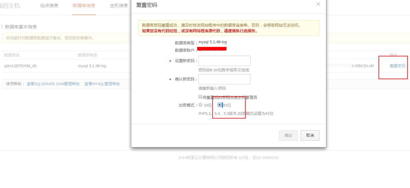 虚拟主机网站上传后提示mysql版本不正确的原因及解决办法 一、问题及原因 mysqlnd cannot connect to MySQL 4.1+ using the old insecure authentication. Please use an administration tool to reset your password with the command SET PASSWORD = PASSWORD('your_existing_password'). This will store a new, and more secure, hash value in mysql.user. If this user is used in other scripts executed by PHP 5.2 or earlier you might need to remove the old-passwords flag from your my.cnf file 上面一段的意思是在本地上进行测试的环境mysql为4.1版本,更换服务器为5.1版本,需要更换php版本和更换mysql的数据加密方式才能解决。 二、解决方法 1、登陆主机管理平台http://cp.hichina.com/ 高级环境设置中修改php版本,如下图所示: 2、在数据库信息中重置数据库密码,修改数据的加密方式,如下图所示: 如问题还未解决,请联系售后技术支持。 下一条: 虚拟主机通过内网连接RDS数据库的方法