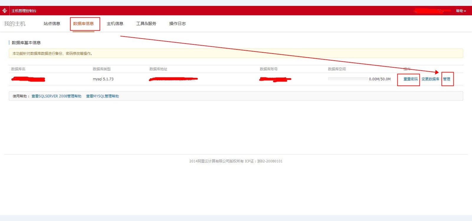 如何解决php程序连接不上数据库的问题 第一步:首先通过DMS平台单独登陆测试,确定密码正确与数据库是否正常,如果密码不正确,请重置密码后测试。 主机控制台登录地址:cp.hichina.com 第二步:查看php程序的配置文件中,数据库的信息填写是不是正确的。建站过程中请参照截图中进行填写,如果填写已经有错误,到对应的配置文件中排查。如下图所示: 第三步:上传php链接数据库的测试样例: http://help.aliyun.com/knowledge_detail/6555094.html?spm=5176.7618386.5.3.2vHmMN 第四步:根据测试样例的返回信息排查,可能是因为php5版本以后mysql数据库需要使用41位的加密方式,重新设置一下密码后再进行测试。 如问题还未解决,请联系售后技术支持。