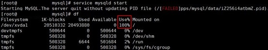 mysql启动报错 quit without update PID file如何解决 用户的Mysql启动报错quit without update PID file。 一般这种问题都是不能写入pid file造成的,使用df命令看下是不是磁盘已经占满了,如果是的话,删除一些垃圾文件就可以解决了。 具体如下图所示: 如问题还未解决,请联系售后技术支持