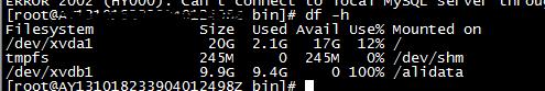 出现Can't connect to local MySQL server through socket 'tmpmysql.sock' (2)的原因及解决方法 一、问题现象:启动mysql报错(具体报错提示如下) Can't connect to local MySQL server through socket 'tmpmysql.sock' (2) 二、问题原因: 一般是磁盘满了造成的 三、解决方法: 查看磁盘状态,如下图所示则显示磁盘满了。如果是磁盘满了,只需删除部分文件后就能够恢复。