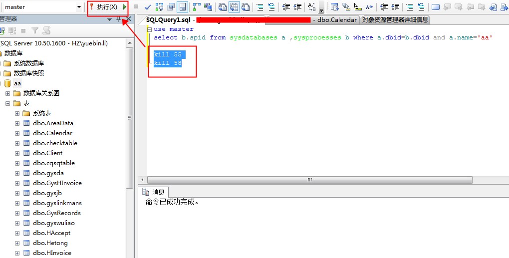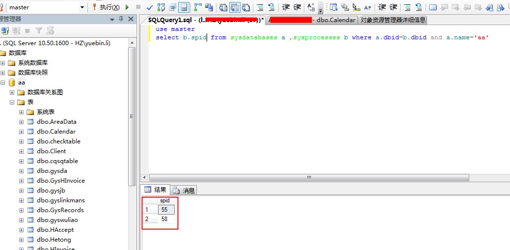 还原sqlserver2008数据提示:因为数据库正在使用,所以无法获得对数据库的独占访问权原因及解决办法 一、问题及原因: 还原sqlserver2008数据提示:因为数据库正在使用,所以无法获得对数据库的独占访问权。如下图所示: 这个是因为数据库正在被某些进程使用或者调用,可以在新建查询里面使用下面sql命令查看对应的spid,以下aa是我们操作的数据库名称 use master go select b.spid from sysdatabases a ,sysprocesses b where a.dbid=b.dbid and a.name='aa' 如下图所示: 查看到spid是55和58,然后kill掉对应进程spid,如下图所示: 再次还原数据库成功,如下图所示: