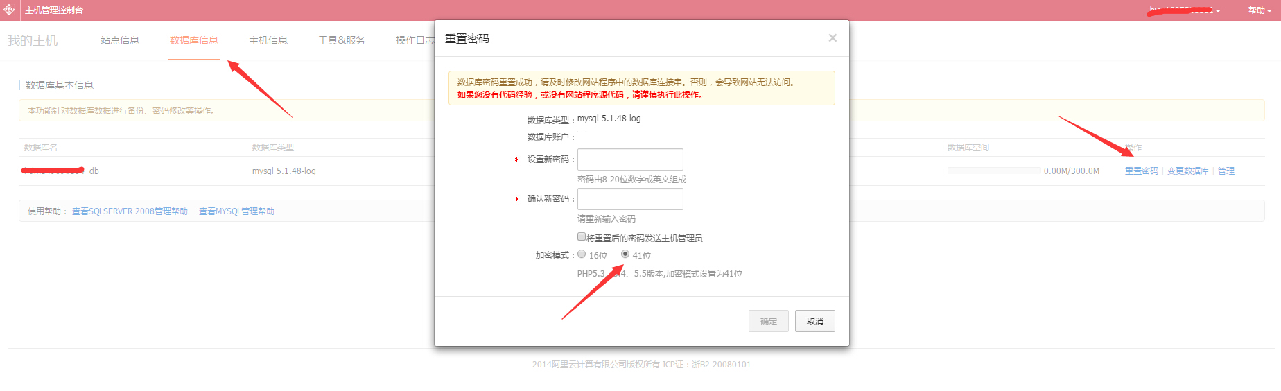 Windows系统轻云服务器运行PHP+MySQL网站提示数据库连接错误原因及解决 一、问题场景: 客户使用之前售卖的Windows系统轻云服务器,支持运行PHP+MySQL程序,访问网站提示数据库连接错误,以DedeCMS为例,如下图所示: 同时登陆cp.hichina.com控制面板点击导航栏数据库信息--管理,使用数据库配置文件里的密码可以正常连接进入数据库。 二、问题原因: Windows系统下PHP5.3与MySQL连接时候使用的加密方式不同,需要41位加密方式 三、解决方法: 第一步、首先登陆cp.hichina.com控制面板,点击左侧高级环境配置--php版本设置,确认当前使用的是不是PHP5.3,如下图所示: 第二步、点击导航栏数据库信息--重置密码,选择41位加密模式,重置下密码,将密码重置为数据库配置文件里的密码,然后再进行访问测试。如下图所示: 如问题还未解决,请联系售后技术支持