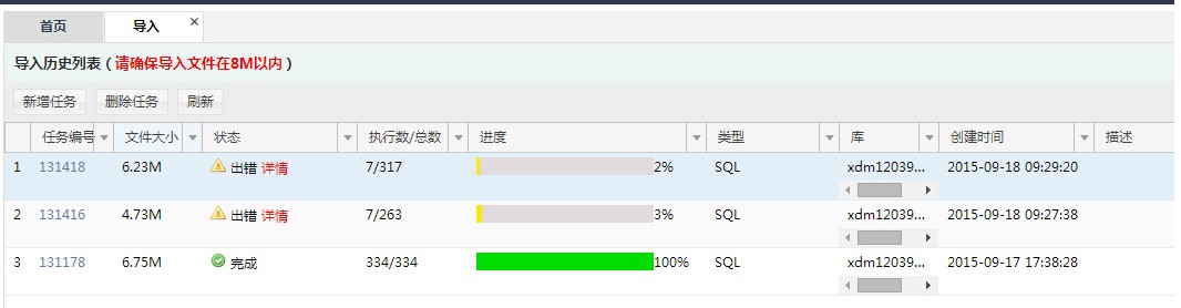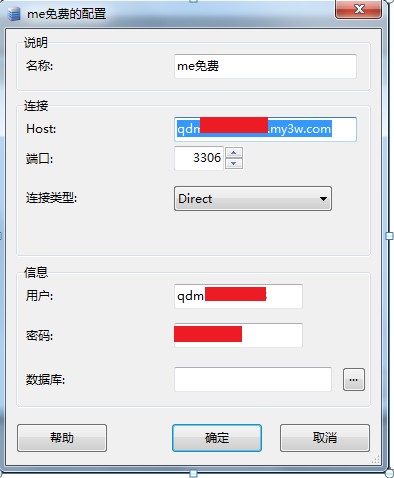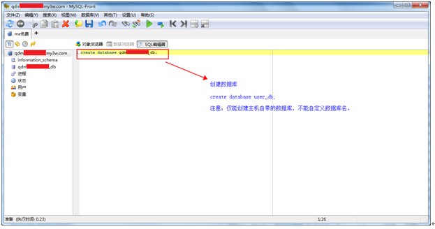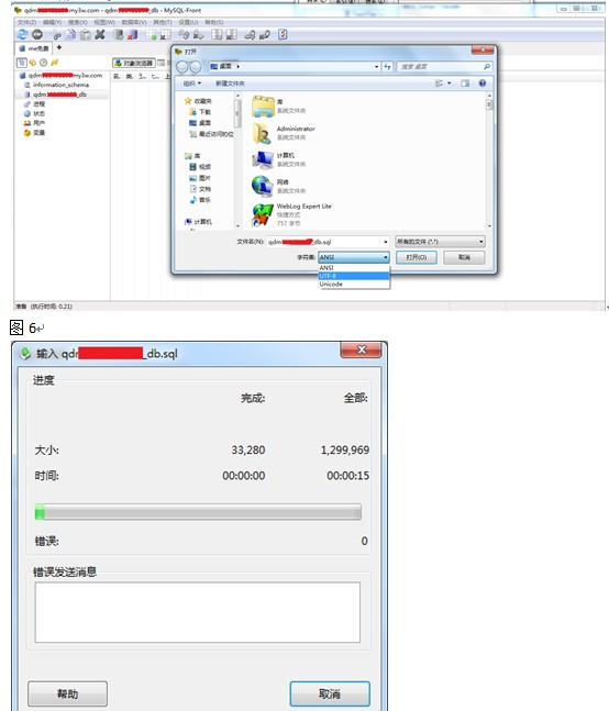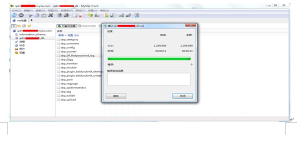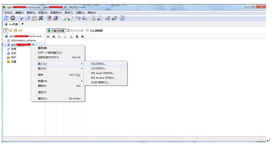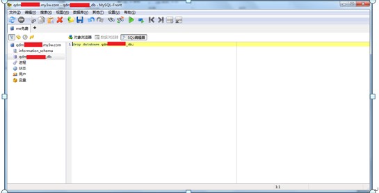 通过Mysql-Front客户端解决虚拟主机DMS数据库管理平台8M上传文件限制的方法介绍 通常情况下,虚拟主机用户在上传导入mysql数据库过程中,如果通过DMS数据库管理平台上传会存在最大8M文件的上传限制。如果需要上传较大的数据库sql文件,可以通过Mysql-front客户端工具方式进行上传解决,如下图所示: 下面就介绍具体操作: 一、使用Mysql-front工具导入方法: MySQL Front是一个小巧的免费版管理Mysql的应用程序,可以通过http://www.mysqlfront.de/官方网站下载该软件。 下面内容介绍通过MySQL Front软件对虚拟主机的Mysql数据库进行删除、创建和导入数据的操作方法。 (1)、MySQL Front登录: 打开MySQL Front,点击新建,弹出新建连接窗口(如下图)。输入下面的信息后,点击确定进行登录: 名称:用于分辨这个连接的信息,可以不填,如果没填的话,会自动以host信息命名。 Host:请填写数据库连接地址。例如qdmxxxxxxxx.my3w.com 端口:默认3306,请勿修改 用户:请输入数据库用户名。 密码:如果不知道可以登录主机控制面板重置数据库密码。 (2)、登录后如下图所示。点击sql编辑器输入 drop database qdmxxxxxxxx_db; 【注:这里的qdmxxxxxxxx_db需要替换为您实际的数据库名称】然后点击执行(绿色三角按钮),即可删除数据库,清空所有数据。 温馨提醒:这个操作会清空所有数据,清空后将不能恢复,请确认已经进行了备份,或者已经不需要。 (3)、 删除后左侧就没有数据库了,如下图所示: (4)、在sql 编辑器窗口输入 create database qdmxxxxxxxx_db; 【注:这里的qdmxxxxxxxx_db需要替换为您实际的数据库名称】执行后就可以在左侧看到数据库了。如下图所示: 注意:只能创建主机控制面板查到的数据库名称,不能使用自定义数据库名。 (5)、右键单击数据库名,选择输入—sql 文件(图5)。打开如图6所示的界面,选择要导入的sql文件,然后点击打开,即开始导入(图7)。 温馨提醒:要选择编码。如果选择错误会导致导入出错,这里选择的是utf8(图6)。 图5: 图6: 如问题还未解决,请联系售后技术支持。