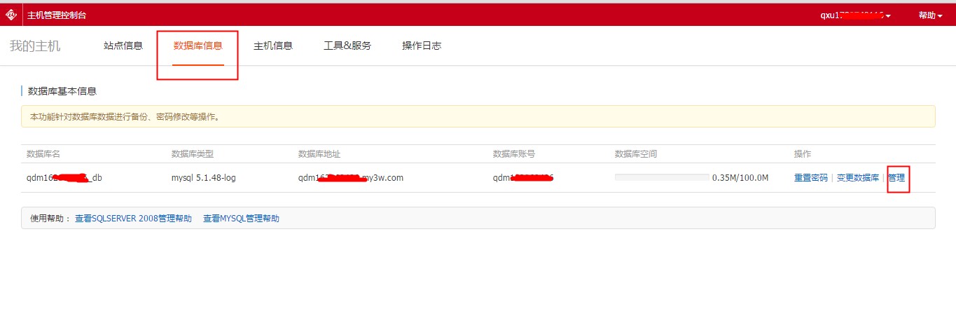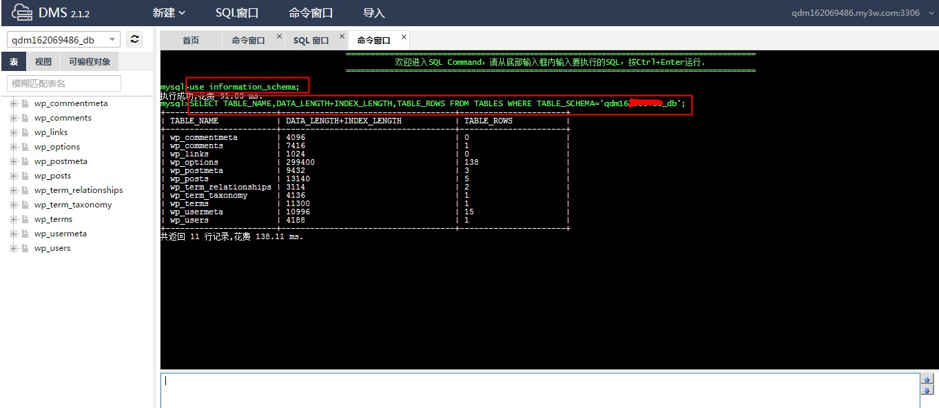 虚拟主机MySQL数据库表大小怎么查看的参考 在使用虚拟主机MySQL数据库时,经常遇到数据库变满的情况。如何查看哪个表占用了最大的数据库空间呢? 答案是在使用主机CP控制台中数据库DMS控制台检查。 首先,打开数据库DMS控制台: 然后,点击SQL 窗口: 再依次输入如下所示命令: use information_schema; SELECT TABLE_NAME,DATA_LENGTH+INDEX_LENGTH,TABLE_ROWS FROM TABLES WHERE TABLE_SCHEMA='qdm1620xxxx_db' 将'qdm1620xxxx_db'替换成自己的数据名,如下图所示: 执行结果的第2列就是数据库表的大小。根据业务情况检查是不是正常的。 由于虚拟主机的数据库不支持单独扩容,如果数据库使用量没有出现异常情况,建议升级主机,以便能够达到扩容数据库的目的。 如问题还未解决,请联系售后技术支持。 上一条: 虚拟主机SQL Server 2008数据库检查各个表占用的空间的方法 下一条: 虚拟主机/青云服务器DMS导入MySQL报错Unknown collation: utf8mb4_unicode_ci的参考解决方法