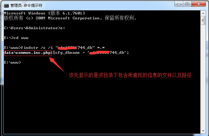 虚拟主机查找网站程序的数据库连接配置文件的方法 一、问题场景: 客户无意在控制面板操作修改了数据库密码之后会发现网站访问出现数据库连接错误的报错,但是不知道修改之前的数据库密码是什么,而且也不知道网站程序的数据库配置文件名和存放路径; 二、解决方法: (1)、先将所有的网站程序下载到本地,放在一个指定的目录下,例如E:\www (2)、打开命令提示符,输入e:,回车,进入e盘根目录,然后输入cd www,回车,进入网站程序所在目录E:\www.具体情况参看下图: (3)、进入之后输入以下命令 findstr /s /i "字符串" *.* 字符串处修改为数据库用户名、数据库地址或者是数据库名称 *.*表示所有类型的文件。 /s 表示当前目录以及所有子目录 /i 表示不区分大小写 测试结果如下图所示: (4)、根据上述方法查到数据库配置文件所在目录,找到该文件之后使用记事本或者其他工具打开,如果文件内容较多,可以先使用ctrl+f查找数据库信息所在位置,在类似dbpwd、passwd字样后方就是数据库密码,可以将此处信息修改为新的数据库密码,然后将修改后的此文件重新上传主机对应的目录下,或者按照登陆cp.hichina.com控制面板将数据库密码修改为当前配置文件里的密码。如下图所示: 特别注意:请在操作任何程序文件修改之前对当前文件做备份 如问题还未解决,请联系售后技术支持