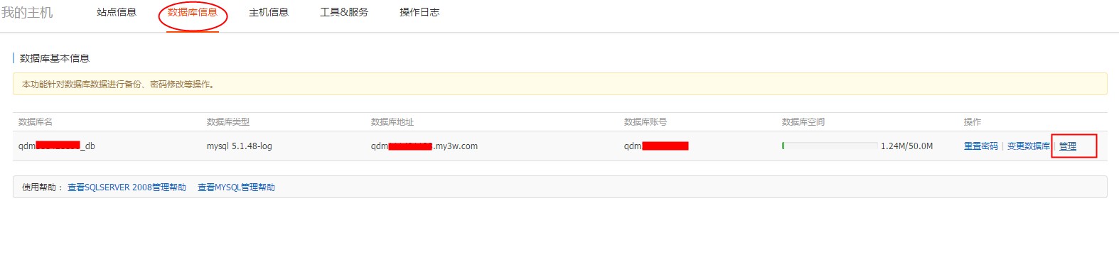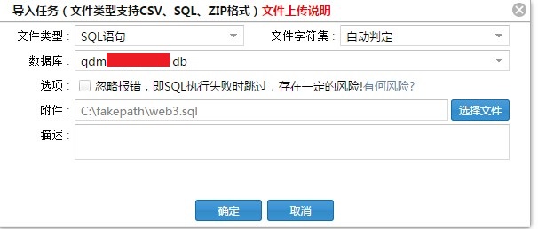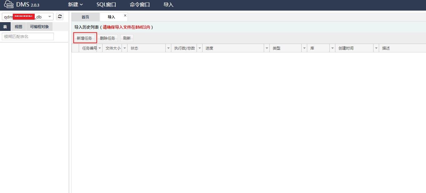 使用DMS控制面板导入Mysql数据库备份的步骤 步骤一、 登录主机控制面板--【数据库信息】,可以看到数据库信息最后后面有管理按钮。如下图所示: 步骤二、 点击管理,然后打开登录窗口输入数据库密码进行登录,如下图所示: 步骤三、登陆后如下图,选择导入,如下图所示: 步骤四、 选择新建任务。如下图所示: 步骤五、 浏览本地文件,选择要导入的sql文件。然后点击确认。等待完成。如下图所示: 温馨提醒: (1)、超过8M的文件不能导入。 (2)、每次只能导入一个sql文件。如果有多个sql文件需要导入,可以将其合并为一个文件。 如问题还未解决,请联系售后技术支持。
