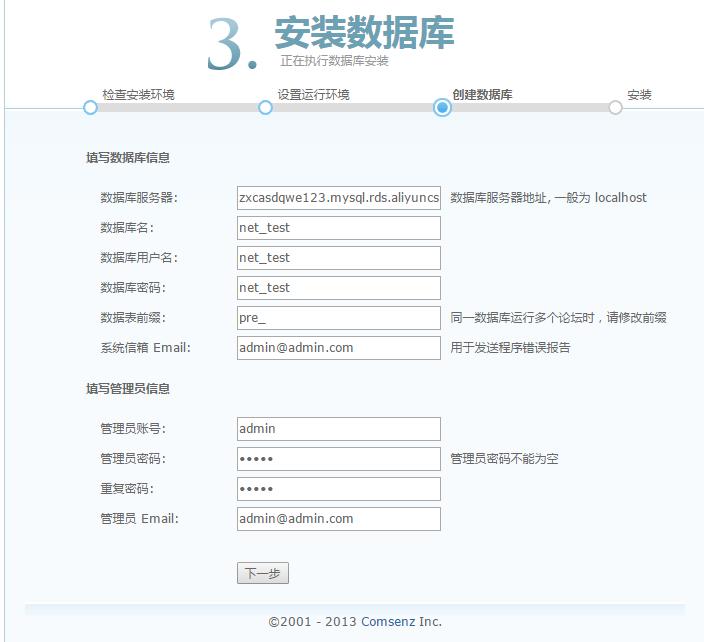 万网云虚拟主机使用阿里云的RDS-mysql服务相关介绍 一、概述 这个文档适用的场景是虚拟主机自带的数据库主机空间已经满了,但是站点数据源码数据难以迁移的情况,这边列举的是一个示例 虚拟主机数据的上传可以参考如下链接 :http://help.www.net.cn/knowledge_detail.htm?spm=5334.7618385.5.2.4F82u7&&knowledgeId=5868398 这个示例采用的是discuz的源码作为RDS连接的案例。 二、具体实例: 第一:RDS示例相关的设置 1、获取RDS-mysql的地址,这个地址可以分为两种情况,如下所述: (1)、虚拟主机和RDS不再同一个可用区(可以理解为城市),必须要使用公网地址的RDS连接地址,缺点是RDS的连接是收费的,优点是能够自由设置白名单。 (2)、虚拟主机和RDS在同一个可用区(可以理解为城市),能够使用内网的RDS连接地址,缺点是不能设置白名单(也就是,客户不能获取虚拟主机的内网ip地址),优点是不产生资费。 2、设置RDS的数据库和用户 这个必须要求新创建一个权限为读写的数据库,同时新创建的用户必须要对这个数据库有读写的权限(程序的设置相关,当然只读实例也是可以的,建议弄明白了再用要不然会产生很多问题) 第二:开始安装discuz,在数据库的连接安装这个步骤会比较慢,建议耐心等待下,RDS一定要保证能够正常连接 这里使用的RDS如下: 地址:zxcasdqwe123.mysql.rds.aliyuncs.com 账号:net_test 数据库名字:net_test 密码:net_xxx(隐藏) 如下图所示: 这样就安装完成了。 如问题还未解决,请联系售后技术支持。