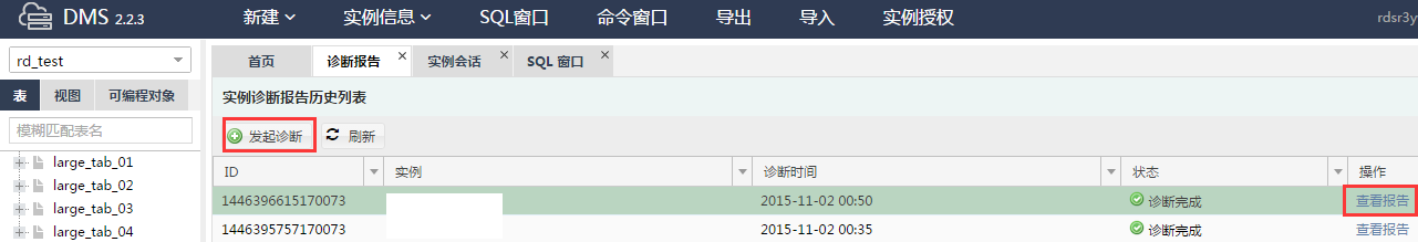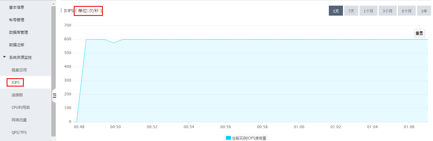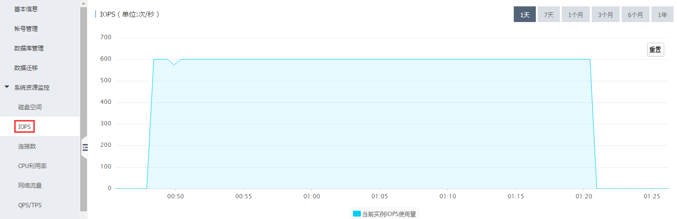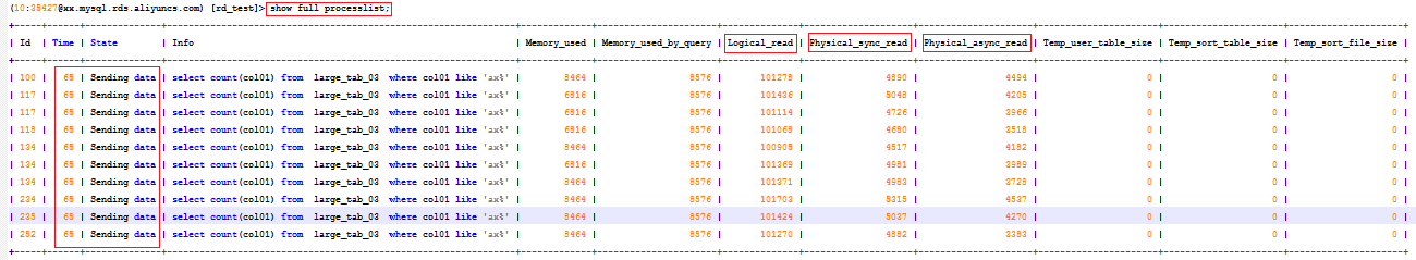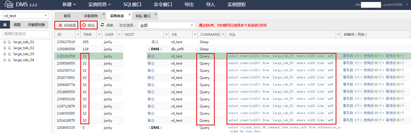 关于RDS MySQL IOPS 使用率高的原因和处理事项 通常来说,RDS MySQL 实例在日常使用中有时会出现实例 IOPS 使用率高的情况,比如: 通常来说,RDS MySQL 实例在日常使用中有时会出现实例 IOPS 使用率高的情况,比如: 1. 原因 查询执行效率低,扫描过多数据行。 实例内存不能够满足缓存数据或排序等需要,从而导致产生大量物理IO。 2. 解决办法 可以通过下面2种途径中的1种来处理IOPS使用率高的问题,也可以结合使用。 生成实例当前诊断报告(推荐方式),具体操作如下: DMS =》实例信息 =》实例会话 或者 show full processlist; 查看正在运行的查询,通过SQL窗口优化功能优化查询。 2.1 诊断报告 在DMS中生成当前的实例诊断报告,查看其中的 会话列表、SQL优化、慢SQL汇总部分,建议应用SQL优化给出的意见。如下图所示: 会话列表: SQL优化: 慢SQL汇总: 建议应用SQL优化给出的意见: 在表 large_tab_03 字段 col01 上添加索引 - alter table large_tab_03 add index idx_col01(col01)。 索引添加完毕后,查询执行快速完成,IOPS使用率降低。如下图: 注: 1. 添加索引操作建议在业务低峰期进行;如果添加过程中出现等待表元数据锁的情况,请参考:RDS MySQL 表上 Metadata lock 的产生和处理 2. 在SQL优化没有直接给出建议的情况下,需要结合会话列表、慢SQL汇总的信息进行查询优化。 2.2 实例会话和SQL优化 有时候会出现 实例诊断报告不可用 或者无法立刻应用其建议的情况,我们可以可以先通过 DMS =》实例信息 =》实例会话 来终止问题查询(需要应用方面首先停止提交问题查询,441111否则会出现不断终止、不断出现的情况)。如下图: 也可以通过命令 show processlist; 或 show full processlist; 来查看会话情况,通过 kill 命令来终止问题查询。如下图: 如果当前执行会话比较对,可以通过 show full processlist; 来确定问题会话,如下图: 附加:为了方便阅读,上图省却了部分命令输出信息。 可以考虑将物理读(Physical_sync_read 和 Physical_async_read)高的查询终止掉。 也可以通过 SQL窗口的优化功能,获取相关查询优化建议。 如问题还未解决,请联系售后技术支持。