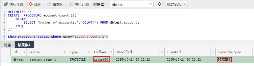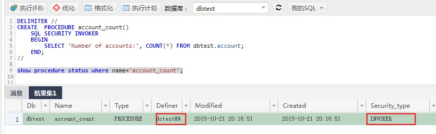 关于RDS for mysql Definer字段的设置的相关事项 在RDS上执行mysql的视图和存储程序(包括:procedures, functions, triggers和events)的时候经常会遇到下面的错误: [Err] 1227 - Access denied; you need (at least one of) the SUPER privilege(s) for this operation (常见于MySQL 5.6) ERROR 1725 (HY000) at line 1936: OPERATION need to be executed set by ADMIN (常见于MySQL 5.5) 由于执行是定义了Definer字段,因而产生了这些错误。当用户在创建上述的存储程序或者视图时,如果指定definer字段就设置了用户执行该存储程序或视图的权限,但当我们如果没有指定Definer字段的时候会默认指定创建时的用户。如下图。在该图中没有指定definer字段创建视图view_1就会生成创建视图的用户。如下图: 调用存储程序或者视图的用户想要正常的访问需要有两方面的权限:1、DEFINER指定的用户必须是mysql.user表中存在的用户(上述描述的是存储程序和视图默认是Definer模式,如果是INVOKER模式下,在存储过程执行时,会检查存储过程调用者的权限);2、调用存储程序的用户必须有存储程序的EXECUTE权限。 在使用过程中经常遇到下述两种情况出现的错误,请注意在修改账号权限或者迁移过程中的存储程序和视图的权限: 1. 用dctest账号创建存储过程account_count并查看其结果,如下图。存储过程的definer仍然是dctest@%,但是为invoker模式。这种情况哪个账号执行该存储过程就会使用调用者的权限来执行该存储过程。如果调用者没有对应的权限就会报错:execute command denied to user 'XXXXXXX'@'%' for routine 'dbtest.account_count'。如下图: 2. 用dctest账号创建存储过程account_count_1并查看其结果,如下图。可以查看到definer是dctest@%,并且为definer模式。这种情况下使用别的账号执行该存储过程是调用存储过程就会以dctest@%的权限来执行,如果用户通过控制台或者API删除了dctest账号对dbtest库的写权限的话就会报错:ERROR 1227 (42000): Access denied; you need (at least one of) the SUPER privilege(s) for this operation。如下图: 如果问题还未能解决,请联系售后技术支持