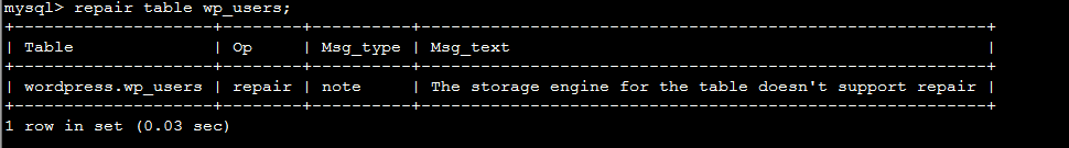 关于RDS(mysql)是怎样修复损坏的数据表的 如果RDS(mysql)使用了myisam引擎,那就很可能会出现数据表损坏的情况,这个时候执行查询可能会提示mysql error:1194:Table 'xxx' is marked as crashed and should be repaired,这个时候我们可以通过下面2种方法来进行修复,修复的过程中可能会导致数据丢失,操作之前最好能做个临时实例进行备份 1. 使用DMS登入上去,选中表 =》右键菜单 =》 表维护 =》 修复表 =》 常规 来修复。如下图: 2. 通过mysql客户端登入到数据库中进行操作,登入到指定的库中,执行下面命令修复。如下图: repair table wp_users; 其中 wp_users是需要修复的表名称 如果问题还未能解决,请联系售后技术支持。