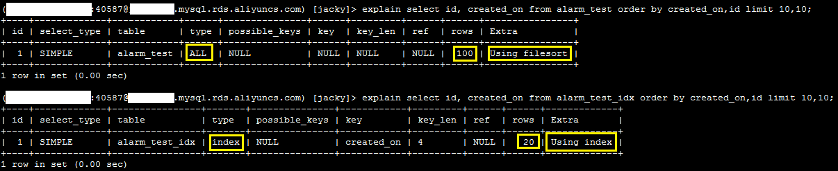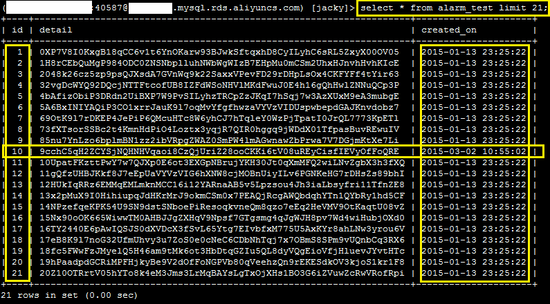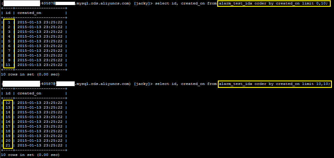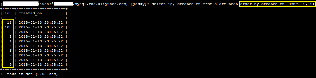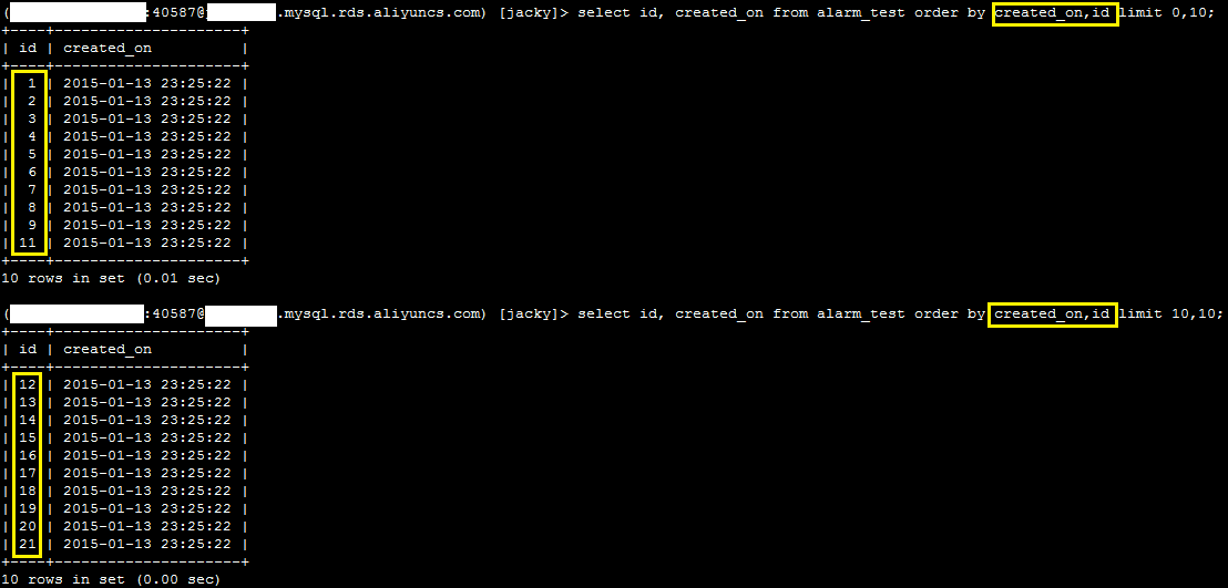 关于RDS MySQL排序分页查询数据错乱的原因和解决事项 1. 某些时候MySQL 排序分页查询会出现数据错乱的情况 比如: CREATE TABLE alarm_test ( id bigint(20) NOT NULL DEFAULT '0', detail varchar(255) CHARACTER SET utf8 NOT NULL, created_on timestamp NOT NULL DEFAULT CURRENT_TIMESTAMP ON UPDATE CURRENT_TIMESTAMP, PRIMARY KEY (id) ) ENGINE=InnoDB DEFAULT CHARSET=utf8mb4; 表内开始的 21 行数据: 注:第10行(id=10)的 created_on 字段值不同。 按照 Created_on 字段值排序,取前 10 行: 按照 Created_on 字段值排序,取从11行开始的 10 行: 可以看出,2次排序分页操作得到的数据是有重合而且无序的(实际上排序分页结果会根据情况的不同而变化,结果不可预料)。 之所以会出现这个问题,原因在于 created_on 字段的值在前 21 行记录中有 20行数据相同。 2. 如何使会出现相同数值的排序字段结果有序 有2个方法: 修改排序规则,加入主键字段,使排序字段不存在重复记录,比如: 在出现重复值的排序字段上添加索引 CREATE TABLE alarm_test_idx ( id bigint(20) NOT NULL DEFAULT '0', detail varchar(255) CHARACTER SET utf8 NOT NULL, created_on timestamp NOT NULL DEFAULT CURRENT_TIMESTAMP ON UPDATE CURRENT_TIMESTAMP, PRIMARY KEY (id), KEY created_on (created_on) ) ENGINE=InnoDB DEFAULT CHARSET=utf8mb4 推荐使用第2种方法(创建索引),在提供可预期的结果同时,提高查询的执行效率: 如问题还未解决,请联系售后技术支持。