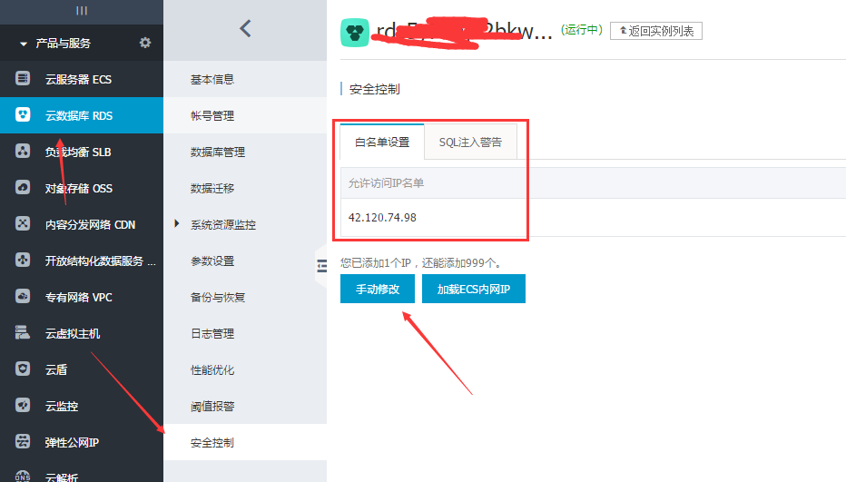 关于RDS MySQLl数据库连接提示错误MySQL server has gone away解决方法 如果连接RDS数据库有提示错误信息“MySQL server has gone away”。 我们可以检查一下RDS的白名单设置,在RDS的白名单中是否有连接数据库的ip地址。 从控制台进入到【云数据库RDS】--【实例列表】点击管理进入实例管理界面,点击【安全控制】查看白名单。如下图: 需要把连接数据库的ip地址拿到白名单中,这里有两种情况:连接RDS的内网地址,就需要添加ECS服务器的内网ip;而连接RDS的公网地址,需要添加公网ip;或者把白名单设置为0.0.0.0/0(没有白名单限制)。然后再重新连接数据库进行测试。 如问题还未解决,请联系售后技术支持