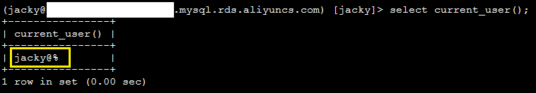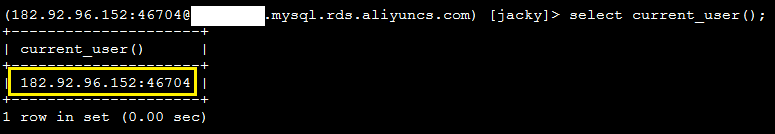 1. 在高安全网络模式下,如果希望 select current_user(); 返回当前连接使用的用户名 请使用下面的查询替代: select concat(user,'@',substring(host,1,instr(host,':')-1)) CU from information_schema.processlist where id = connection_id(); 2. 不同网络模式 select current_user(); 返回的结果不同。 对于采用标准网络模式的实例,select current(); 查询当前登陆用户时,会返回当前连接使用的用户名。如图所示: 对于上述采用高安全网络模式的实例,select currnt_user(); 查询当前登陆用户时,会返回当前连接的端口和客户端IP结果,如图所示: 如问题还未解决,请联系售后技术支持。