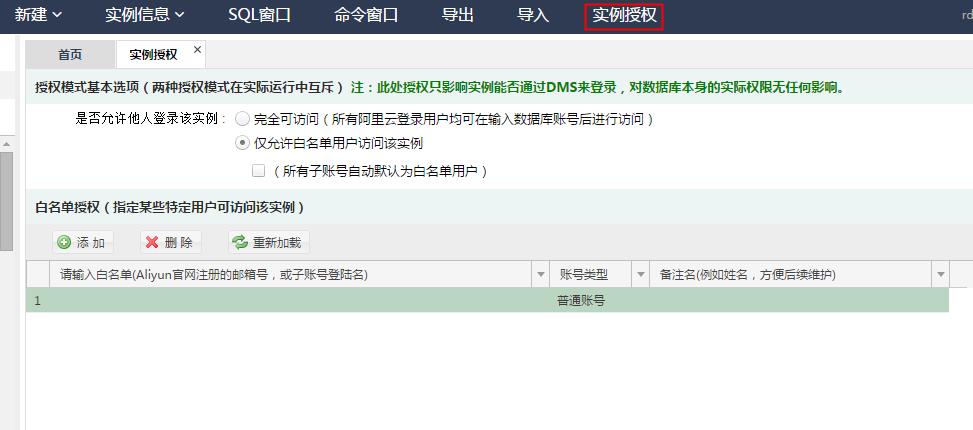 与DMS设置实例授权相关问题 DMS作为管理RDS的重要组件之一,为用户提供基本mysql操作、导入导出以及实例信息等功能。DMS的登陆接口如下图所示。点击登陆数据库,输入正确的数据库用户名密码即可登陆DMS。如下图所示: 上述操作都有一个前提:必须先通过阿里云的账号和密码登陆阿里云的管理控制台后才能够正常的操作。因此,建议用户不要将阿里云的账号和密码透漏给太多的工作人员,这也是为了保护阿里云的账号和密码的安全。因此DMS实现了实例授权功能,可以实现不登录该主账号即可登陆DMS进行权限范围内的操作。实例授权操作如下图所示。 用户可以在这里设置是否允许别人不登录该RDS实例所在主账号的情况下,是否可以直接通过DMS访问。这里可设置允许白名单的用户访问或者允许所有的用户访问(不建议),在设置白名单的时候可以有两种方式:子账号和普通账号。这样就可以设置对应的账号可以登陆RDS。另外白名单中的普通账号如果通过勾选所有子账号自动默认为白名单用户的话,这个主账号下的所有子账号均有权限登陆。 如问题还未解决,请联系售后技术支持 下一条: DMS中添加视图中算法是什么含义?