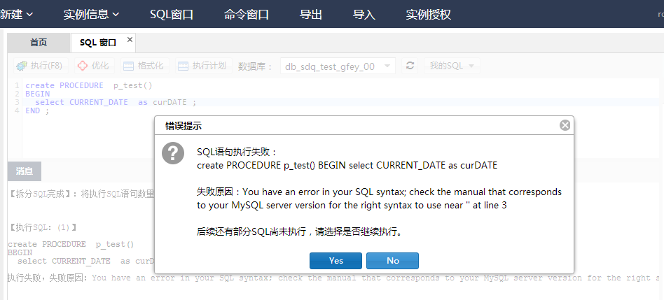 在DMS中创建存储过程选择多行时报错的处理方法 dms中使用sql语句创建存储过程时报如下错误: 错误原因: 存储过程需要执行一段sql,这些sql是不可分的,但在dms中默认是以一个分号;作为一条语句结束的标志。 处理方法: 对这段sql加上开始和结束标志符,下面以//为例,修改sql代码如下: 这样按F8就执行成功了; 注意:最后一句delimiter ;意思是还原为以分号作为结束标识符的默认设置. 如问题还未解决,请联系售后技术支持。 上一条: DMS中添加视图中算法是什么含义? 下一条: 在DMS中检查表显示的每项是什么含义?