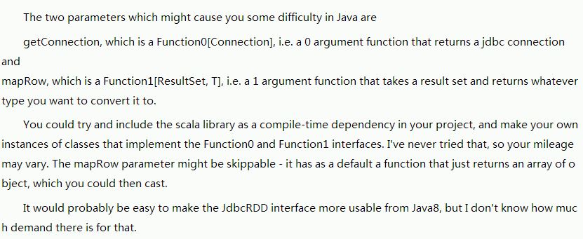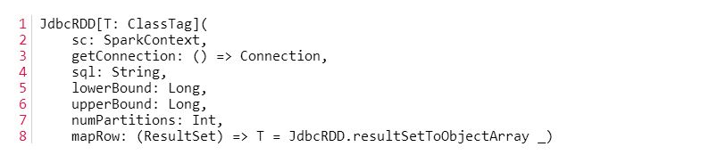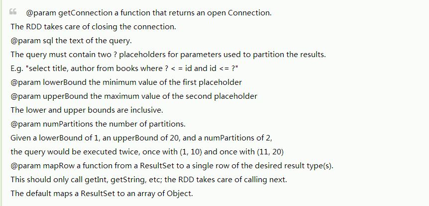 Spark和Mysql(JdbcRDD)整合开发 Spark的功能非常强大,我们讨论了《Spark和Hbase整合》、《Spark和Flume-ng整合》以及《Hive的整合》。我们今天的主题是聊聊Spark与Mysql的组合开发。 图1 在Spark中提供了一个JdbcRDD类,该RDD就是读取JDBC中的数据并转换成RDD,之后我们就可以对该RDD进行各种的操作。我们先看看该类的构造函数,如图2所示: 这个类带了很多参数,关于这个函数的各个参数的含义,我觉得直接看英文就可以很好的理解,如下面所示: 我来翻译一下。