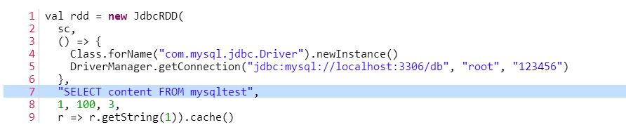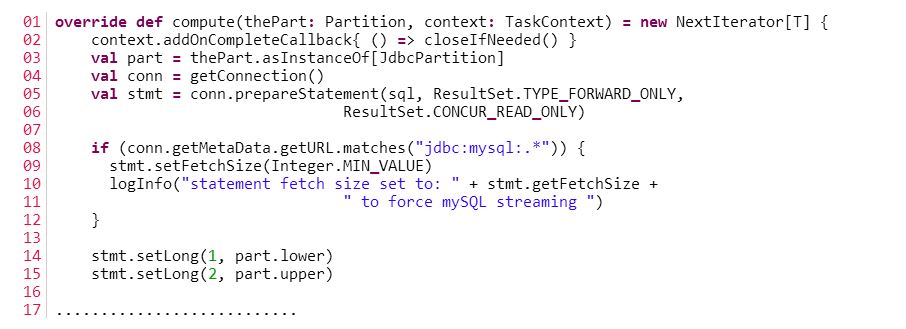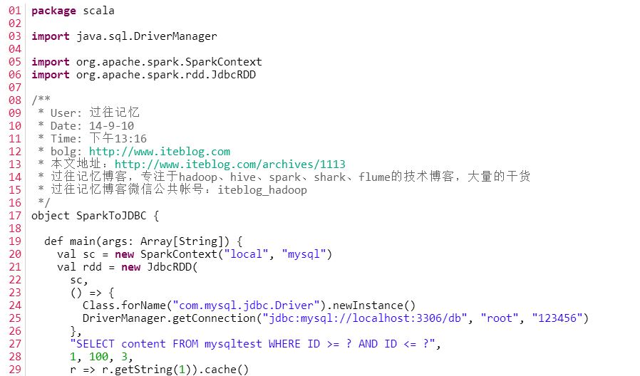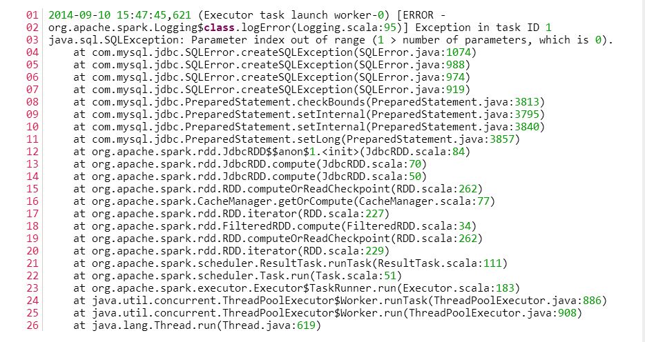 下面我们说明如何使用该类,请参考下图的代码。 代码比较简短,主要是读mysqltest 表中的数据,并统计ID>=1 && ID < = 100 && content.contains("success")的记录条数。我们从代码中可以看出JdbcRDD的sql参数要带有两个?的占位符,而这两个占位符是给参数lowerBound与参数upperBound定义where语句的上下边界的。从JdbcRDD类的构造函数我们可以知道,参数lowerBound与参数upperBound都只能是Long类型的,并不支持其他类型的比较,这个使得JdbcRDD使用场景比较有限。而且在使用过程中sql参数必须有类似 ID >= ? AND ID < = ?这样的where语句,若你写成下面所示的形式: 那在运行的时候会出现以下的错误: 看下面JdbcRDD类的compute函数的实现就可以知道了: 不过令人高兴的是,我们可以自定义一个JdbcRDD,修改上面的计算思路,这样就可以得到符合我们自己要求的JdbcRDD。 注: 在写本文的时候,本来我想提供一个JAVA例子,但是JdbcRDD类的最后一个参数很不好传,网上有个哥们是这么说的: I don't think there is a completely Java-friendly version of this class. However you should be able to get away with passing something generic like "ClassTag.MODULE. 下面的英文是我发邮件到Spark开发组询问如何在Java中使用JdbcRDD,Spark开发组的开发人员给我的回复信息如下: 所以我也只能放弃。若你知道怎么用Java实现,欢迎留言。 下一条: Flume-ng和Mysql整合开发